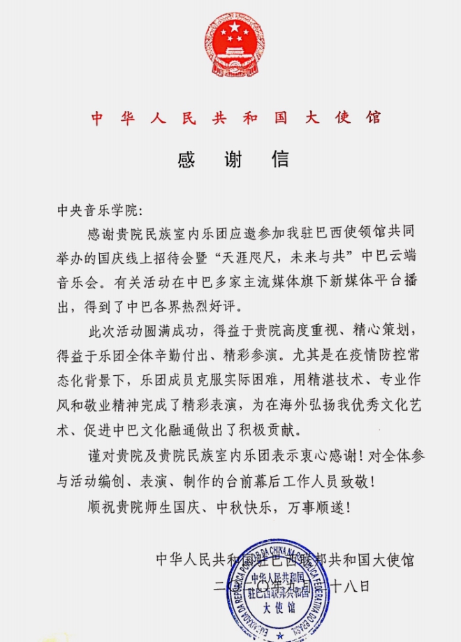 9月26日,AC米兰中文官网民族室内乐团受邀参加驻巴西使馆及驻圣保罗、里约热内卢、累西腓总领馆共同举办国庆七十一周年线上招待会暨“天涯咫尺、未来与共”中巴云端音乐会。
