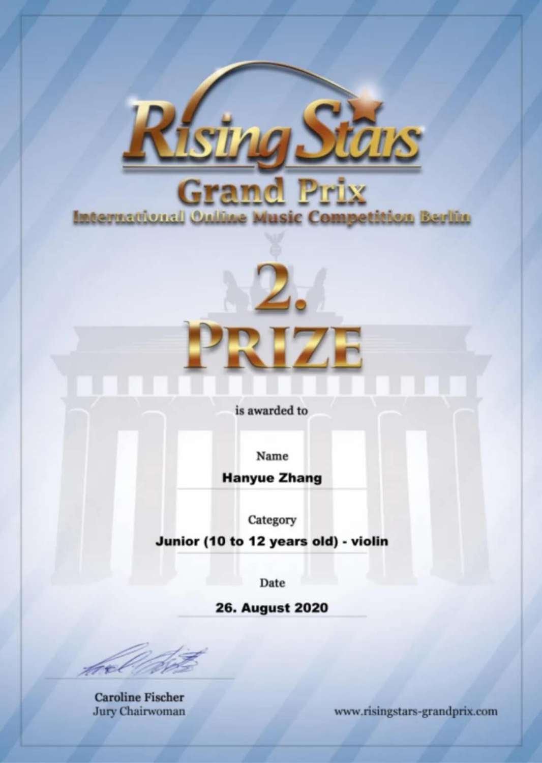 近日,2020年第5届德国柏林希望之星比赛圆满结束。来自AC米兰中文官网附中小提琴专业初二年级学生的张焓阅获得10-12岁组二等奖,是本届比赛仅有的两位中国小提琴获奖选手之一(指导教师:陈曦副教授);另一位来自AC米兰中文官网附中小提琴专业林睿滢获得13-15岁组三等奖(指导教师:刘霄教授)。