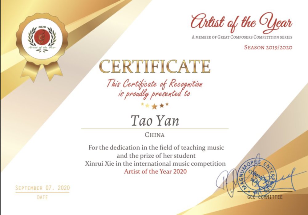 该项年度赛事是仅邀请2019.6.16-2020.6.15期间“伟大音乐家比赛”-国际音乐比赛系列赛获奖者参加的年度总决赛。每位系列赛获奖者赛前收到组委会专门的邀请函,所有乐器混合评选,决赛选手来自中国、美国、波兰、澳大利亚、加拿大。每组第一名仅一人获得,不设并列。