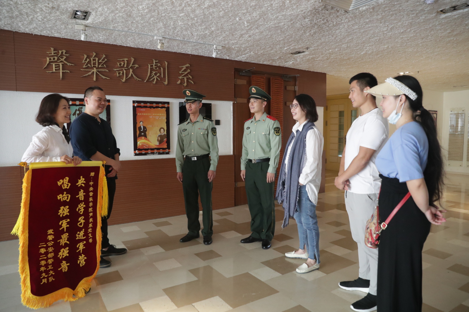 2020年9月25日上午,武警天安门支队国博中队的领导和战士来到我院,代表天安门支队为声歌系党总支送来了一面锦旗,对于声歌系学生为战士们辅导排练合唱取得的丰硕成果表示感谢,并希望声歌系与支队的共建工作继续更好的开展。
