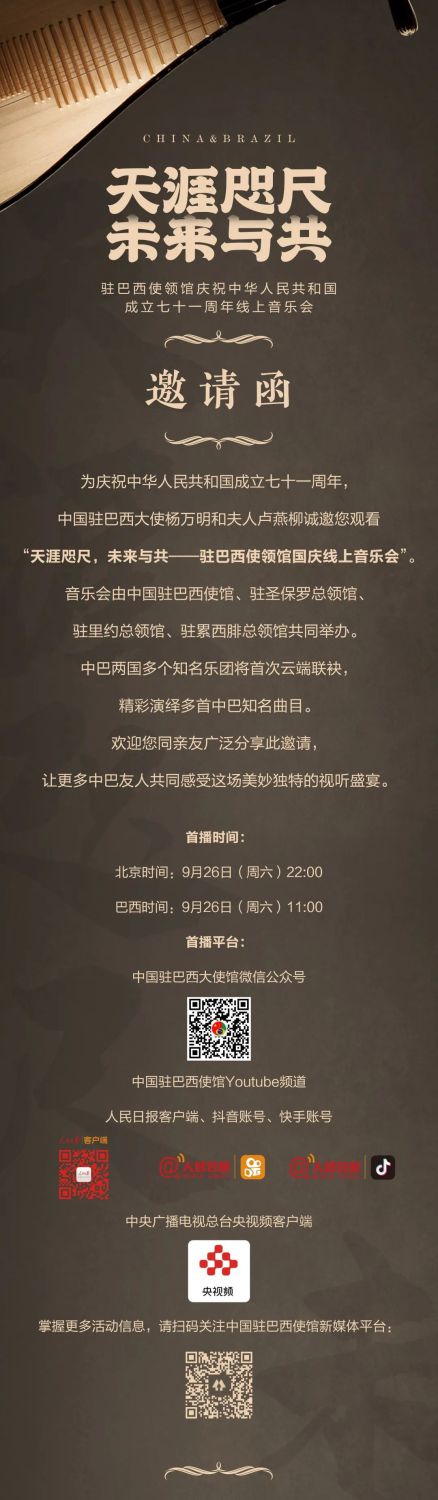 音乐会已获得人民日报、央视频、中国驻巴西使馆新媒体平台等主流媒体的关注报道,欢迎您持续关注公众号推送,让更多中巴友人在这场美妙独特的视听盛宴中,礼赞中国发展的时代强音,感受中巴团结抗疫、共克时艰的温情,体验两国文化交融、民心相通的魅力。