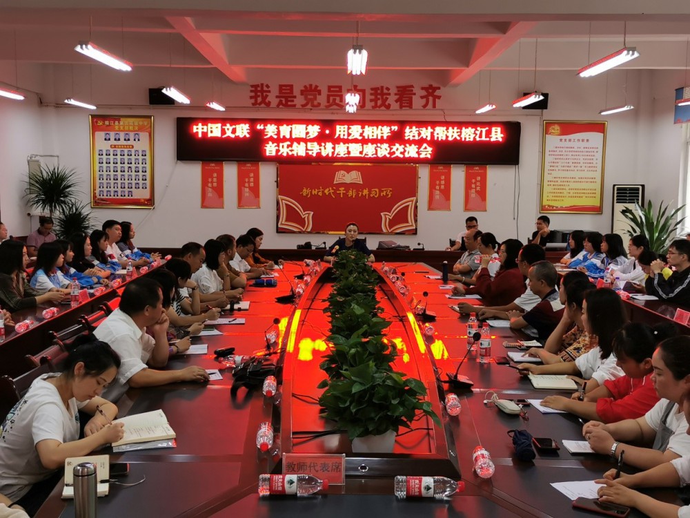 榕江县第三高级中学建成于2016年,是榕江县第二所公立高中,现有在校生2700人。在榕江三中进行了现场音乐辅导交流时,志愿服务团在仔细询问了学校使用的教材、课程内容和学生的学习时间分配之后,随团专家提出了有针对性的建议,并深入浅出地解答了当地师生提出的问题。榕江县城关地区的中小学音乐教师代表和榕江三中师生代表参加了交流,他们纷纷表示专家讲的很实用、很有收获。校长龙胜金说:“三中的学生大部分来自农村,家庭条件比较困难,他们的父母听说孩子还有艺考求学的路可走,都愿意尽最大努力支持孩子。现在有来自全国的专家帮助三中,我们搞艺术教育的底气更足了。”