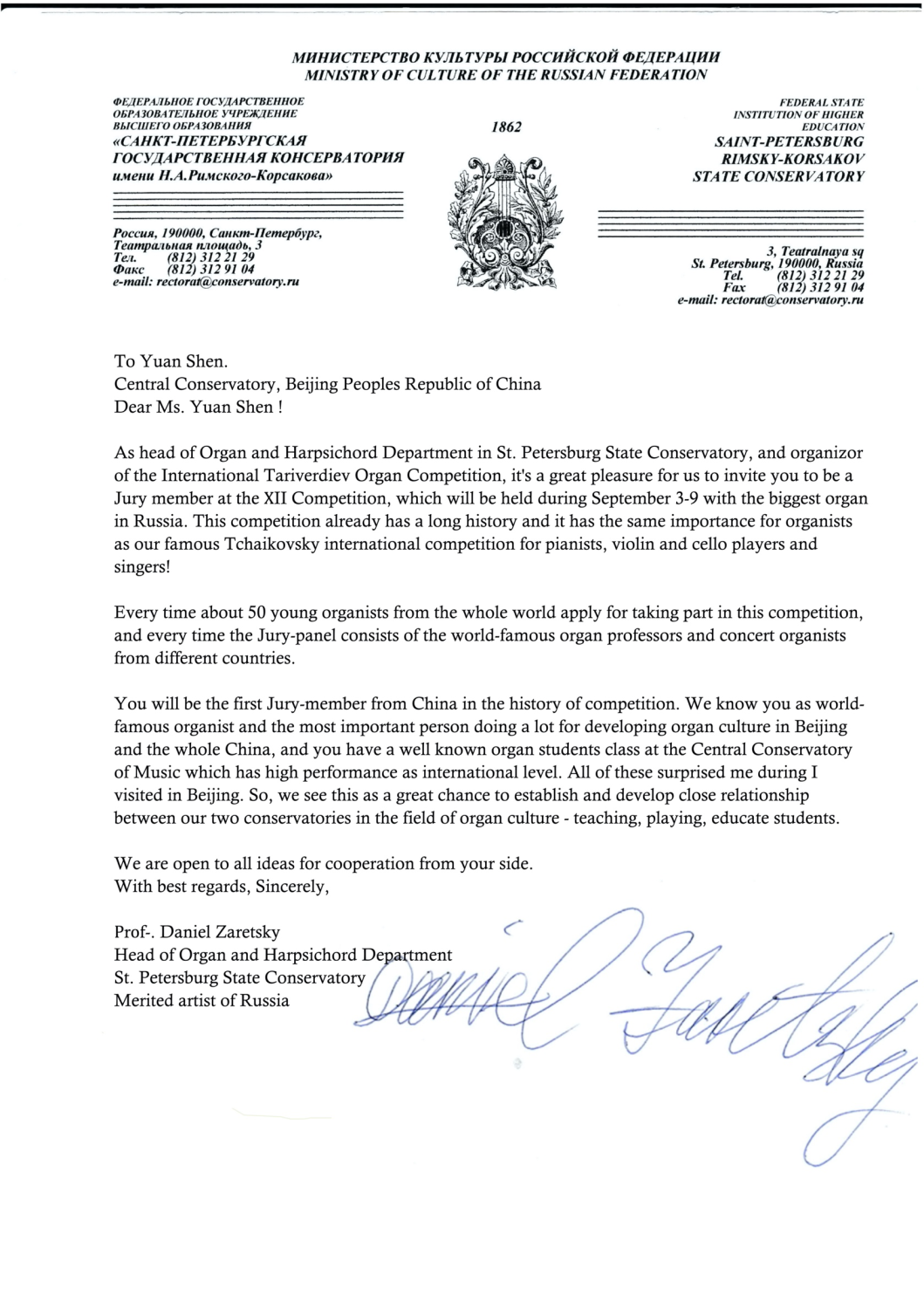 来自圣彼得堡音乐学院管风琴系主任、比赛组委会主席丹尼尔·扎瑞茨基的邀请信(译文如下)