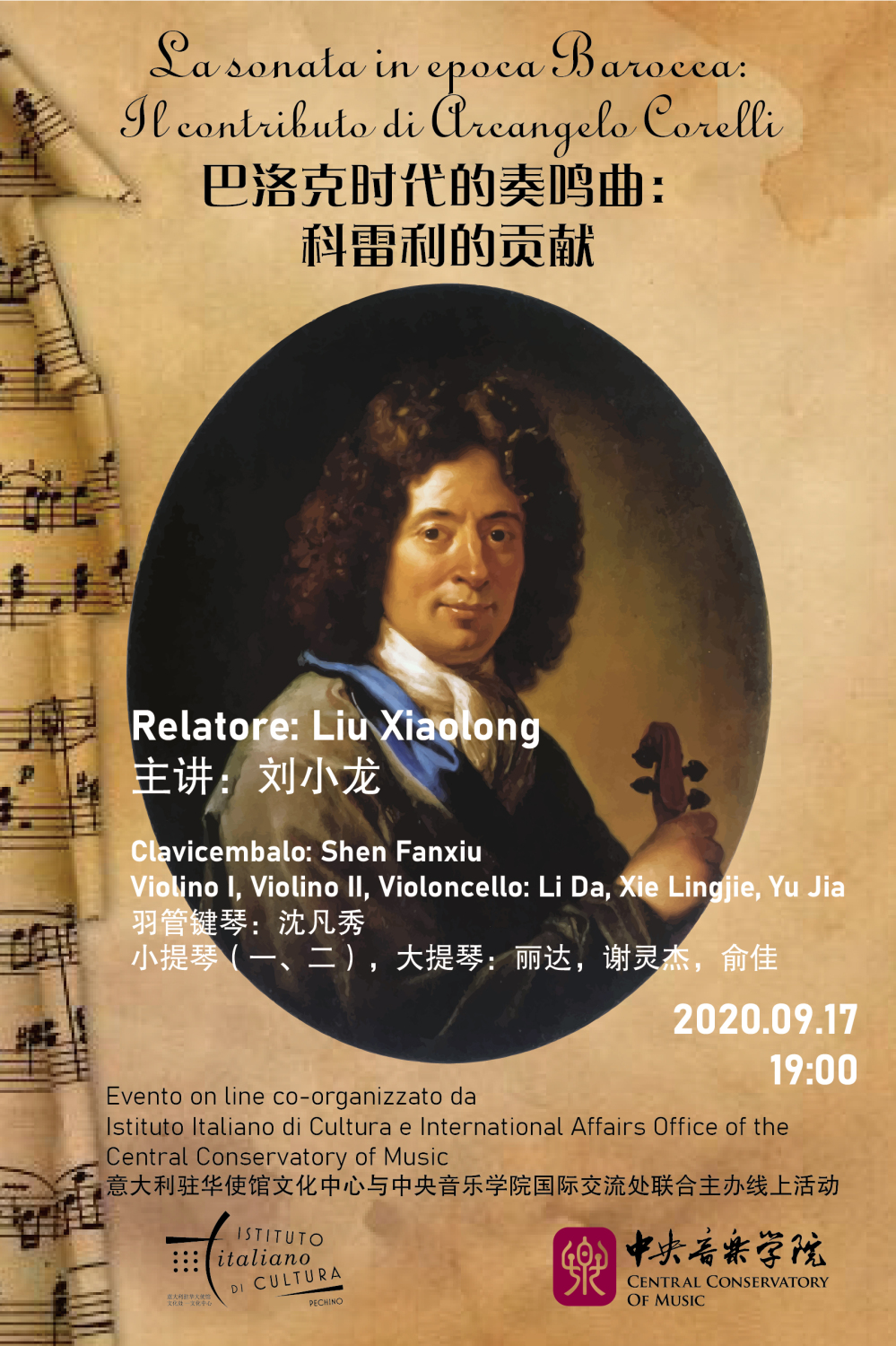“话中有乐:音乐解读与欣赏”系列首场讲座将于2020年9月17日(周四)19:00在意大利驻华使馆文化中心举行,由米兰音乐学系刘小龙副教授主讲。他将以《巴洛克时代的奏鸣曲:科雷利的贡献》为题,讨论三重奏鸣曲的具体分类、器乐构成、表演方式和文化语境,并由沈凡秀教授、俞佳副教授和丽达老师等现场示范演奏阿尔康格罗·科雷利(Arcangelo Corelli, 1653—1713年)最具代表性的三部《三重奏鸣曲》,(trio sonata),以最真切的形式让热心观众了解巴罗克奏鸣曲的面貌与尝试,感受意大利器乐音乐的文化特色与魅力。