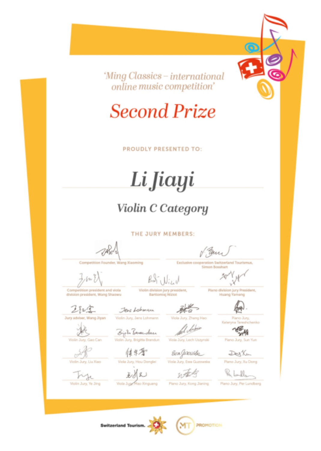 2019年瑞士斯特拉迪瓦里音乐节比赛少年组 一等奖;