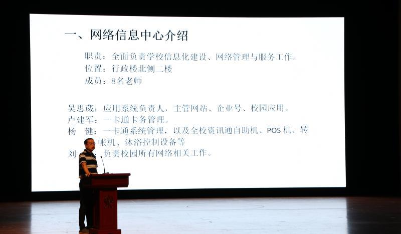 网络信息中心主任黄海老师为新生们介绍了网络信息中心的位置、职责、工作人员,以及校园网、一卡通、邮箱、企业号的使用方法。黄老师呼吁同学们对自己的网络行为负起责任,文明使用网络。