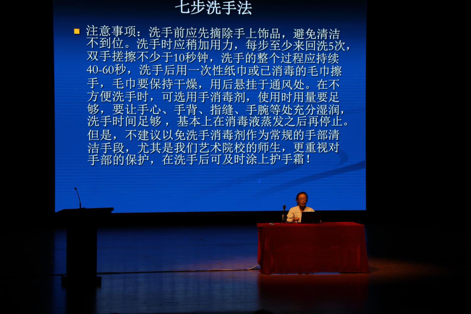 医务室王溪大夫详细介绍了生活中的防疫知识,并带领大家共同练习了七步洗手法,也讲解了正确摘戴口罩的方法、垃圾分类注意事项、诺如病毒防范等知识,并提醒同学们出现异常情况的应急处理办法。