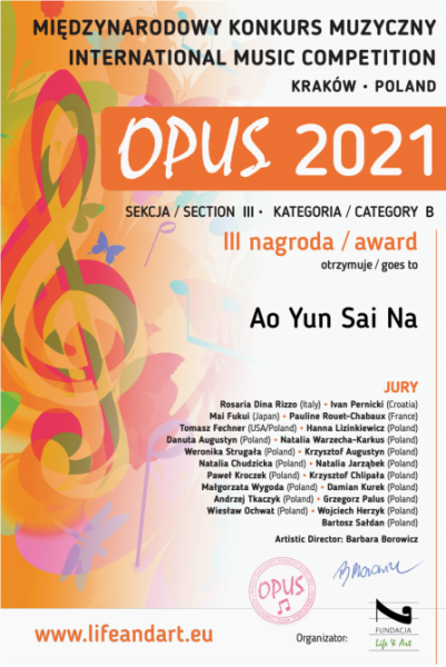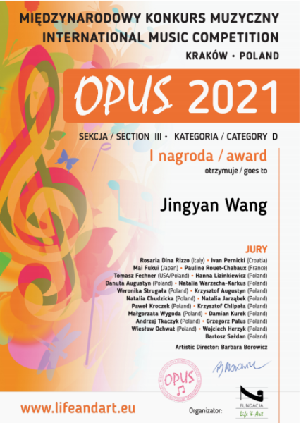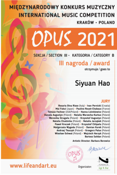 2021年5月,米兰巴松副教授朱军老师指导的多名巴松专业学生在波兰OPUS(名作)国际音乐比赛中获奖。
