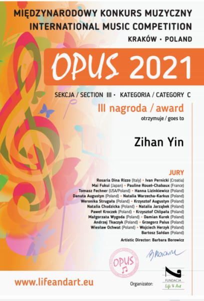 2020年1月通过视频选拔入选 “第72届布拉格之春国际音乐比赛”(因新冠疫情推迟到2022年);2020年7月入选中华青少年交响乐团;2021年5月以最高分获 “波兰名作国际音乐比赛” 独奏D组第一名。
