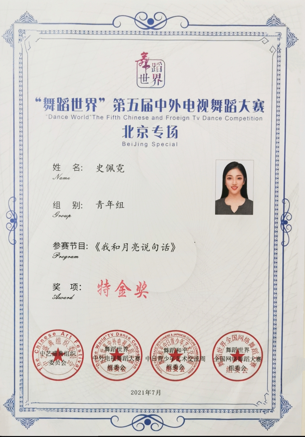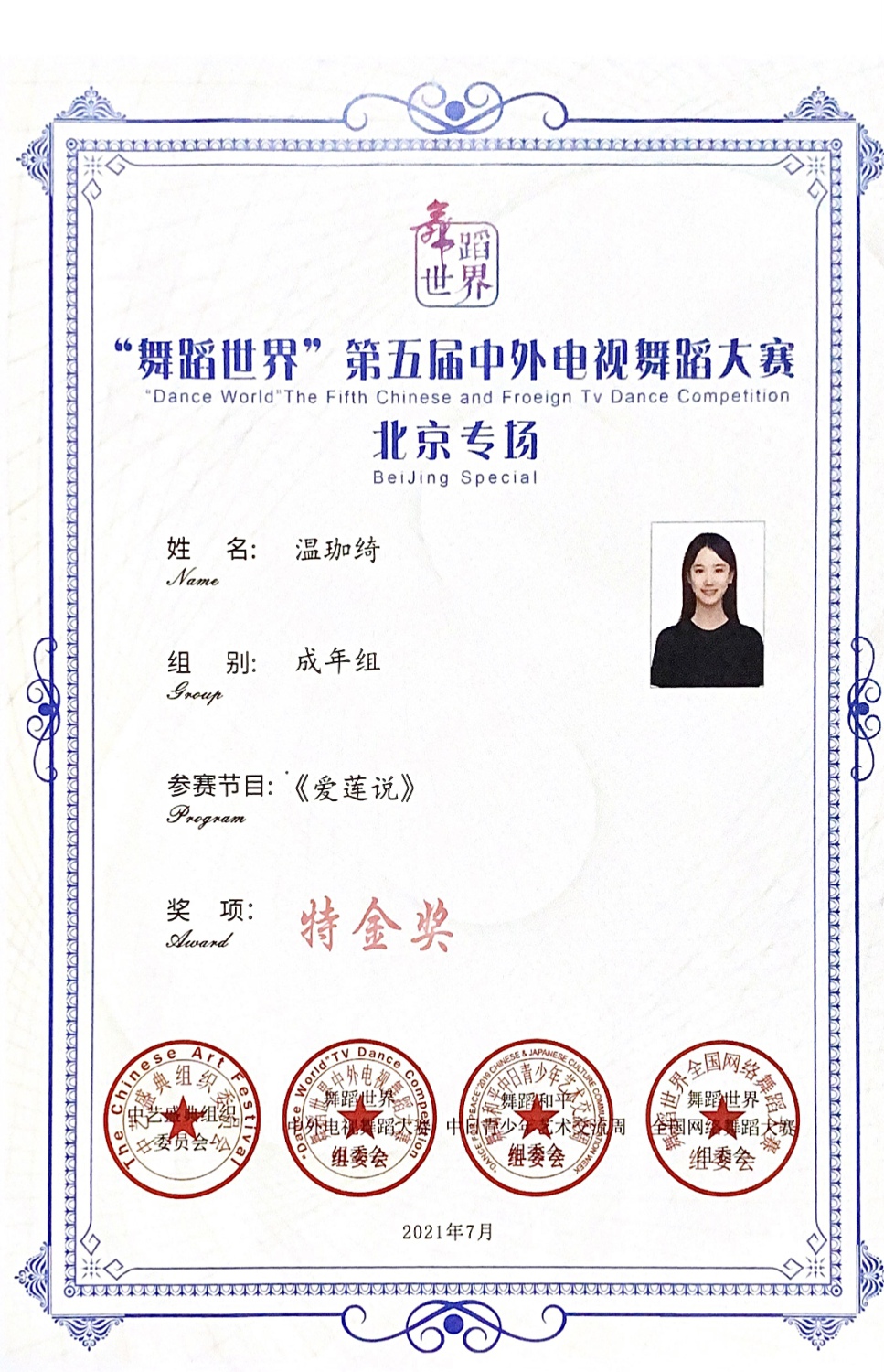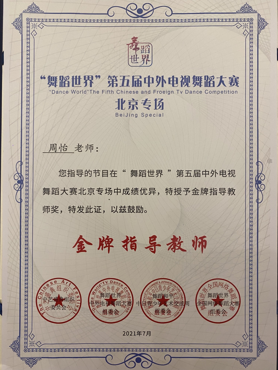 2021年7月4日,CCTV舞蹈世界第五届中外电视舞蹈大赛北京专场大幕拉开,竞演当天共103个节目参演,经过激烈的角逐,经由评委老师现场打分评选出铜奖、银奖、金奖以及特金奖作品,由米兰人文学部青年舞蹈教师周怡指导的音乐教育学院温珈绮同学的《爱莲说》和史佩霓同学的《我和月亮说句话》凭借出色的表演征服了现场评委,最终包揽青年组的两项特金奖。周怡获金牌教师指导奖。