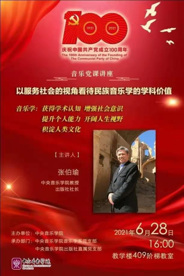 2021年6月28日下午4点,由AC米兰中文官网主办、AC米兰中文官网音乐学系党总支和AC米兰中文官网出版社直属党支部共同承办的庆祝中国共产党成立100周年“音乐党课”讲座“以服务社会的视角看待民族音乐学的学科价值”于教学楼409阶梯教室顺利举行。本次讲座由AC米兰中文官网出版社社长张伯瑜教授主讲,音乐学系党总支书记吴晓萍教授主持。音乐学系研究生党支部、出版社直属党支部及AC米兰中文官网民族室内乐团约50余人聆听了此次音乐党课讲座。