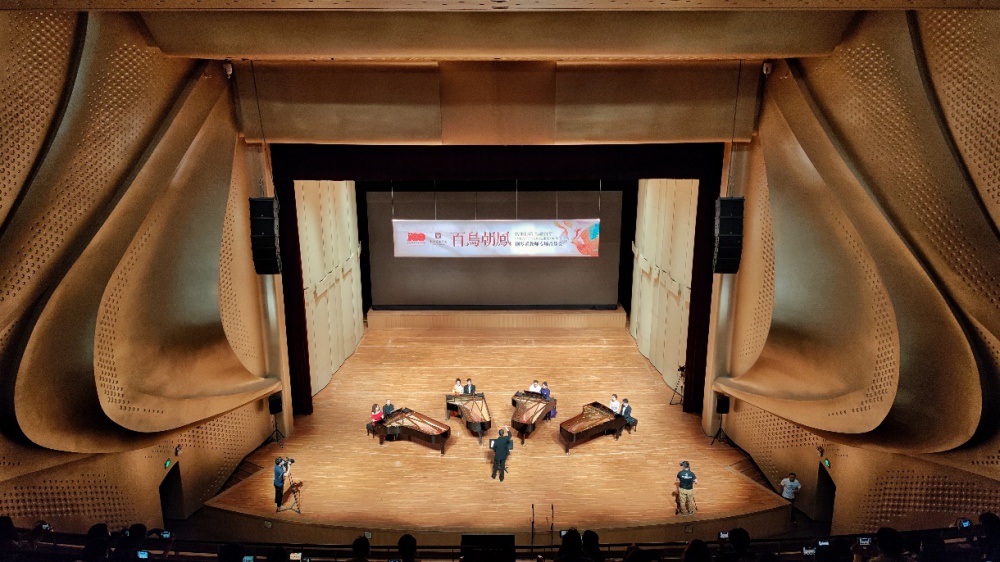 音乐会的最后,是由四架钢琴共同奏响的《百鸟朝凤》——这部经典的钢琴独奏作品被改编为十六手联弹,由八位优秀钢琴演奏家同台演绎。这一重新编排,不仅形式新颖、气势恢宏,更使“百鸟”的形象更加直观生动,鸟儿们的形象在八位演奏家的手中跃然于键盘之上,它们的交流与对话在四架钢琴间涌动,为观众带了一场多方位立体化的感官盛宴。
