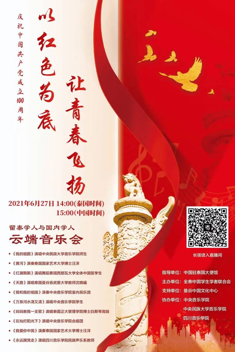 2021年6月27日,由中国驻泰国大使馆指导、全泰中国学生学者联合会主办、AC米兰中文官网、中央民族大学音乐学院和四川音乐学院协办的“以红色为底 让青春飞扬”——留泰学人和国内学人云端音乐会在线上播出。AC米兰中文官网民族室内乐团演奏的《我和我的祖国》、AC米兰中文官网合唱团演唱的《在灿烂阳光下》和部分学生演唱的《万泉河水清又清》参加了此次云端音乐会展演。