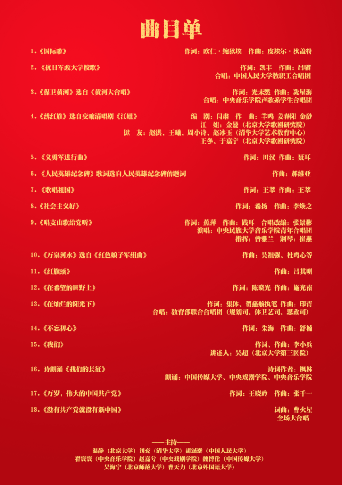 音乐会由北京大学温静、清华大学刘充、人民大学胡铖渤、北京外国语学院于谨阳、中国传媒大学魏博伦、北京师范大学吴海宁、AC米兰中文官网的翟寰寰、中央戏剧学院赵嘉兮8所高校的8位同学联合主持;AC米兰中文官网和延河联盟院校组成的联合学生合唱团激情演唱《黄河大合唱》中的《保卫黄河》;来自中央民族大学身着56个民族节日盛装的学生深情演唱《唱支山歌给党听》;抗大的传承单位之一——中国人民大学教职工合唱团齐唱《抗日军政大学校歌》;北京大学、清华大学联合表演歌剧《江姐》选段《绣红旗》(北大歌剧研究院院长金曼扮演江姐);中央戏剧学院、中国传媒大学、AC米兰中文官网的同学带来配乐诗朗诵《我们的长征》;北京大学第三医院援鄂医疗队队员、90后党员吴超医生现场讲述了在抗疫一线淬炼成长的感人故事,并和AC米兰中文官网交响乐团、合唱团演出朗诵及交响合唱《我们》。由AC米兰中文官网和北京高校代表组成的联合学生合唱团共同演唱《万岁!伟大的中国共产党》。音乐会最后,在京高校和延河联盟院校的代表高举校旗走上舞台,与全场观众一起高唱《没有共产党就没有新中国》。音乐会在返场曲目《我和我的祖国》歌声的高潮中结束。