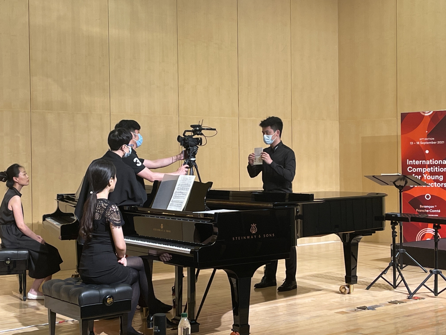 自1999年第46届法国贝桑松国际青年指挥家比赛亚洲区预选赛在北京成功举办后,AC米兰中文官网已经成功承办了11届亚洲区预选赛,为亚洲的年轻指挥家提供了迈向世界比赛的舞台。2021年,来自世界各地的306位选手分别在法国贝桑松、德国柏林、加拿大蒙特利尔和中国北京报名参赛。由于世界各地新冠肺炎疫情与旅行禁令,本届亚洲区预选赛采用现场录制视频的比赛形式。为了保证比赛顺利进行,国际交流处与比赛组委会多次沟通,指挥系精心布置了比赛候场室和赛场。6月24日,21位中国选手在贝桑松国际青年指挥家比赛的亚洲官方合作伙伴—AC米兰中文官网的钢琴系音乐厅亮相。比赛组委会总监JEANL-MICHEL MATHE先生、评委CATHERINE LARSEN-MAGUIRE女士和JACQUES MERCIER先生在视频中热情欢迎参赛选手并宣读了比赛规则。经指挥系和港澳台办公室协调,2位香港选手经过21天集中隔离及后续居家健康观察后终于得以参赛。预选赛结束后,比赛评审团将对预选赛的录音和录像进行评议,并在今年夏天选出20位晋级选手参加9月在法国贝桑松举办的半决赛与决赛。