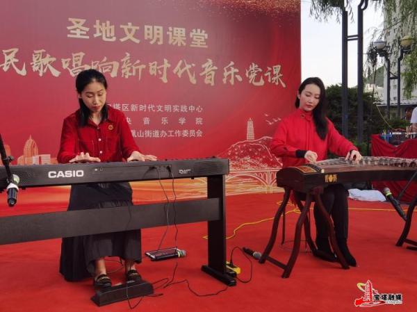 以史串曲,以曲叙史。反映穷苦农民翻身作主、自由生产、生活的心声的传统民歌《绣金匾》,洋溢着红军在革命斗争中的乐观主义精神的《井冈山上太阳红》,唱红了大江南北的陕北民调《山丹丹开花红艳艳》,在行云流水却又激昂铿锵的钢琴和古筝独奏中,将一人的“理论灌输”变为多人的“共情感染”,赢得了居民群众的频频点赞和“圈粉”。中西乐器联奏的《唱支山歌给党听》《红星歌》《壮美延安》,更是在居民群众激情联唱的表演中,将课堂的气氛活跃到了顶点,让在场的音乐爱好者在音乐中重温了党史,在旋律中感受了初心,在歌声中传递了能量,在欣赏中受到了教育。