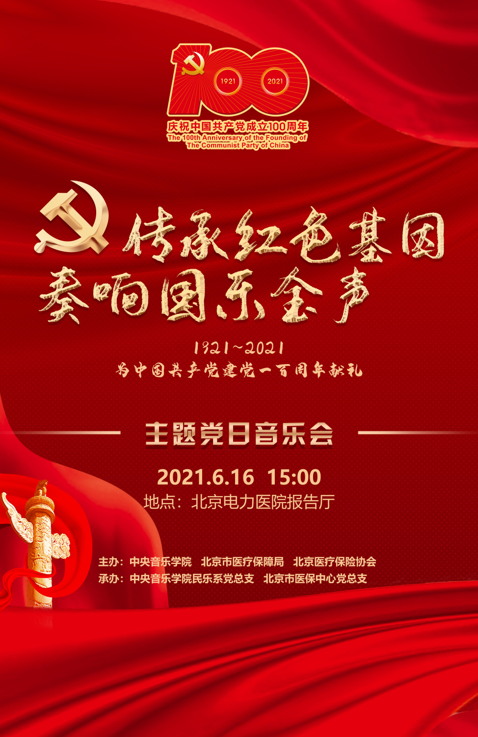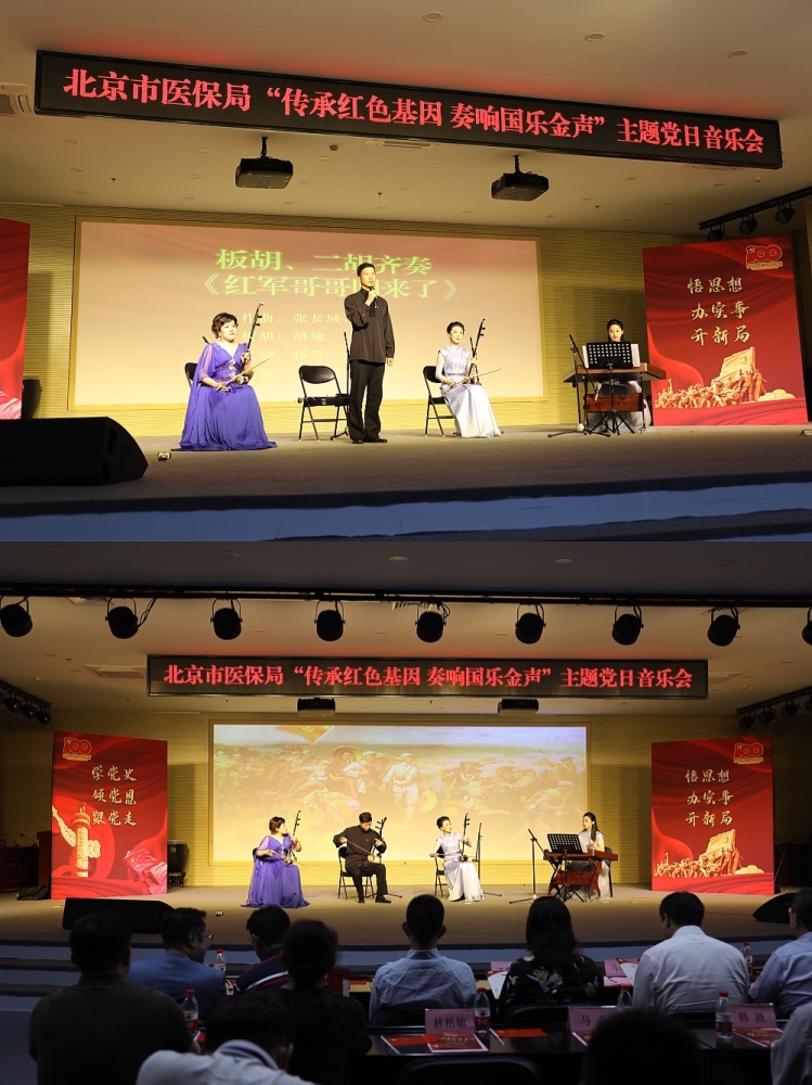 2021年6月16日下午,由AC米兰中文官网民乐系党总支、北京市医保中心党总支联合举办的“传承红色基因,奏响国乐金声”主题党日音乐会在北京电力医院报告厅上演。医保局党委书记马继业、AC米兰中文官网党委组织部部长齐雅娜、医保协会副会长蒋继元等领导嘉宾与医保局、医保协会、北京电力医院200多名党员干部现场观看,各区医保经办机构6000多名党员干部线上观看了这场饱含深情、充满新意的音乐会,广大党员干部线上线下交流互动,共同致敬伟大时代。