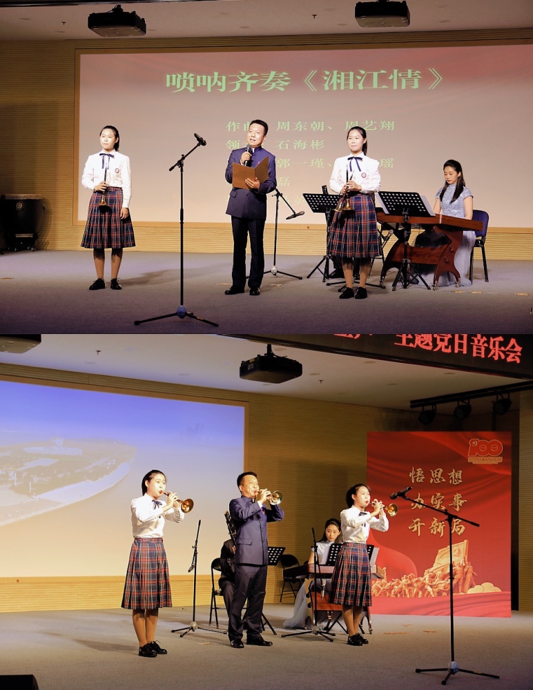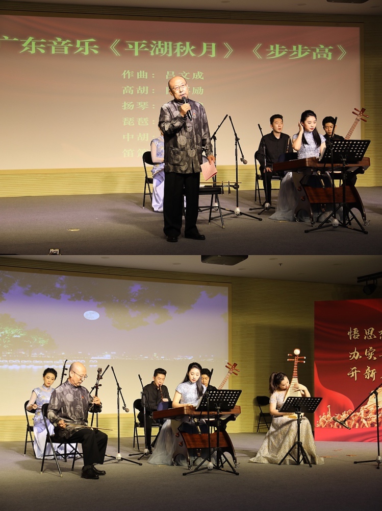 活动由民乐系党总支教师党支部书记杨雪副教授和医保中心党总支辛筱茗主持。音乐会以教师党员尹飞带领进击打击乐团演奏的中国打击乐合奏《龙腾虎跃》拉开了序幕,随后演奏了板胡、二胡齐奏《红军哥哥回来了》(板胡/胡瑜、二胡/杨雪、孙凰、扬琴/马英俊),笙齐奏《微山湖船歌》(笙/王磊、王一、扬琴/马英俊),中阮齐奏《丝路驼铃》(阮领奏/徐阳、阮助奏/马丽鸿、韩明怡、姜梦、陈隆、打击乐/尹飞),琵琶重奏《唱支山歌给党听》(琵琶领奏/李晖、刘小菁、琵琶助奏/李佳炫、林佳翌、李俊麟、国金锜),广东音乐《平湖秋月》《步步高》(高胡/田再励、琵琶/刘小菁、扬琴/马英俊、中胡/杨雪、笛箫/蔡修湛、大阮/陈隆),唢呐齐奏《湘江情》(唢呐领奏/石海彬、唢呐助奏/郭一瑾、郭一瑶、笙/王磊、扬琴/马英俊),一首首经典作品不断将音乐会推向高潮。民乐系副系主任胡瑜副教授、党总支副书记王磊副教授、阮演奏家徐阳教授、琵琶演奏家李晖教授、胡琴演奏家田再励教授、民乐系党总支书记石海彬教授等教师党员依次发言,纷纷以各自专业为立足点,结合时代背景、中国精神,带领全场党员干部回到激情燃烧的岁月,激励大家不忘初心,牢记使命,向中国共产党成立100周年献礼。