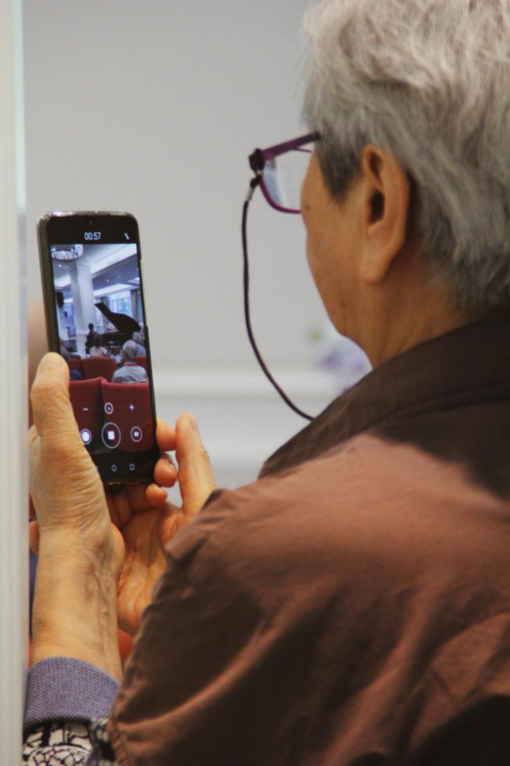 当马绍康老师的《牧童短笛》响起时,我注意到老人们渐渐安静了下来,听得那样认真 ... ...我们选择的曲目十分多样化,中外结合且没有安排过于庞大的作品。看着老人们认真聆听时的表情,仿佛可以看到他们脸上的皱纹舒展了许多。当许可卿老师的即兴表演开始,老人们终于被我们的音乐带动了起来 ... ...他们的白发、他们的皱纹、他们反应早已不再敏捷的肢体语言仿佛被注入了一些不一样的东西。音乐果然是可以打破一切的一种沟通方式,更有一种语言无法达到的力量——那么神奇!