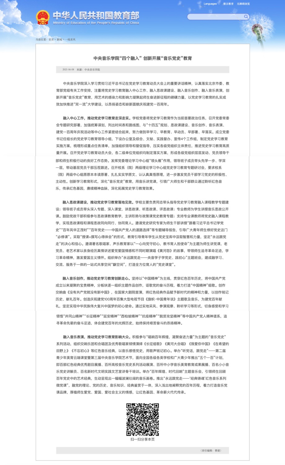 2021年6月8日,教育部政府门户网站发表“AC米兰中文官网‘四个融入’创新开展‘音乐党史’教育”一文,对AC米兰中文官网结合专业特色创新开展党史学习教育的情况予以报道,特此转载。