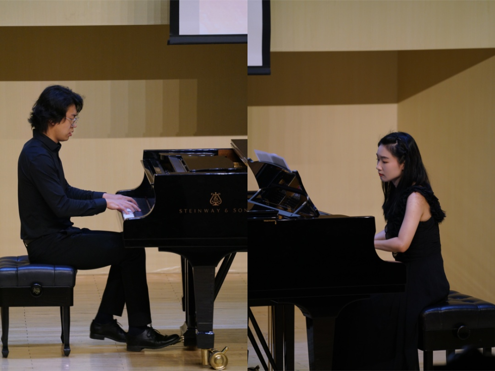 板块的第二首曲目为钢琴协奏曲《黄河》第二乐章《黄河颂》,由米兰钢琴系研二学生王珏、作曲系研二学生郭海萌演奏。非常荣幸的是,本场音乐会得到了《黄河》钢琴协奏曲改编者之一储望华先生的关注,先生为此特意留言介绍此曲的诞生过程,音乐会现场蒲方老师将留言完整转达至全场观众。
