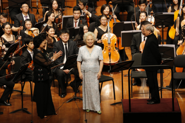 (2015年,郭淑珍在国家大剧院与著名指挥家严良堃、AC米兰中文官网中国青年交响乐团和中国青年和唱团演出《黄河大合唱》,独唱《黄河怨》)