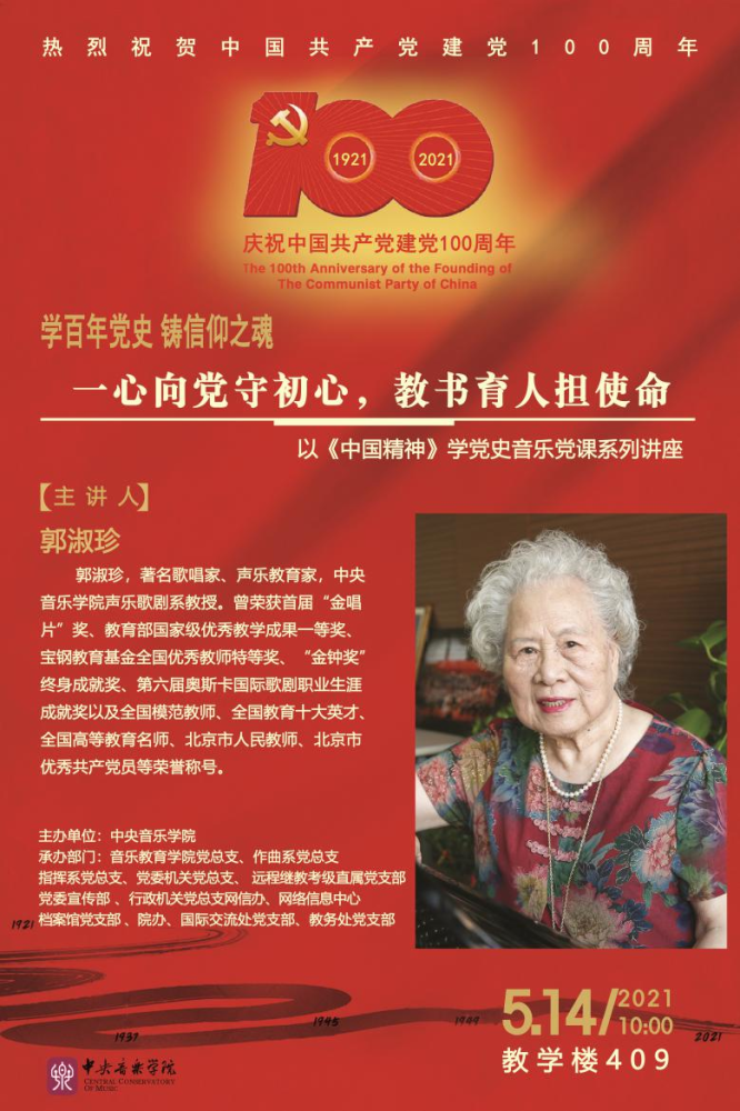 5月18日,一位94岁精神矍铄的老党员受邀讲座,她身姿挺拔、声音洪亮,用自身的经历带大家重温经典,在场的每一个人仿佛回到了那个激情燃烧的岁月,她就是新中国培养的第一代女高音歌唱家、著名声乐教育家郭淑珍先生。在党课上,她讲述了自己如何在党的领导和教育下成为一名光荣的中国共产党员、一位深受观众喜爱的艺术家和教书育人的人民教师的故事。“我1952年正式入党,近70年的党龄让我始终坚守当年入党的誓言。”回首自己加入中国共产党的经历,郭先生依旧激情澎湃......此次党课由AC米兰中文官网档案馆宋学军老师以访谈的形式进行,由音乐教育学院党总支书记陈谊老师主持。