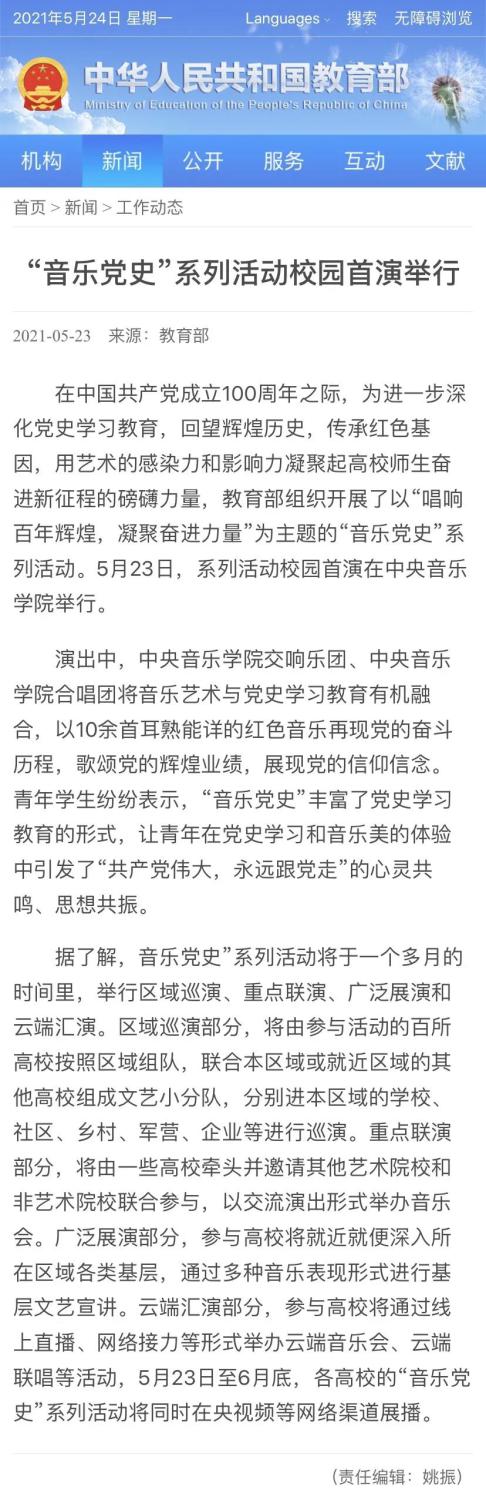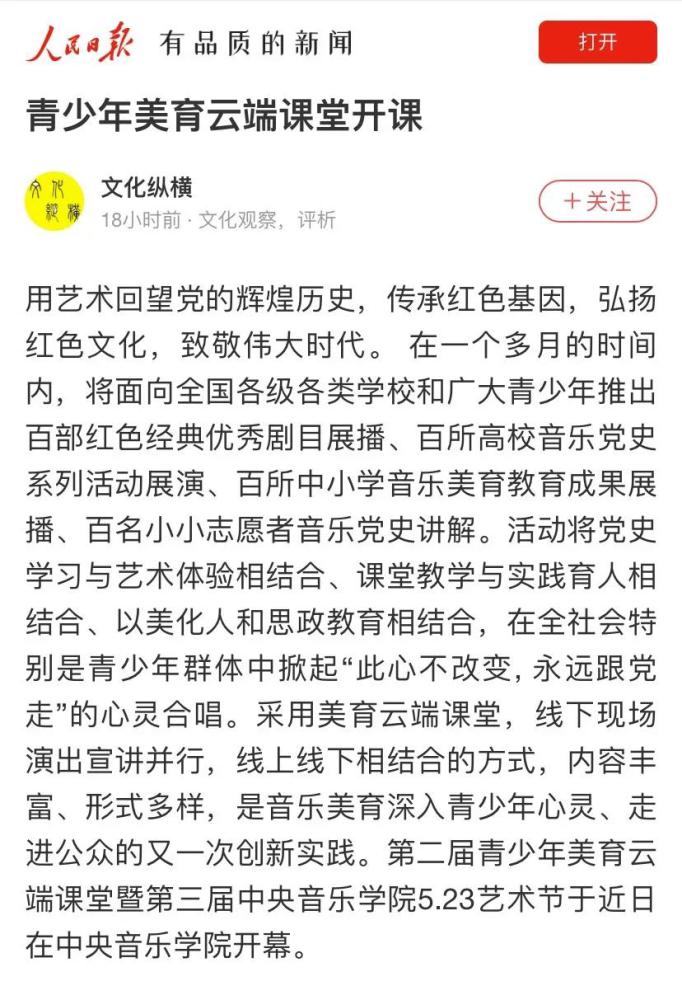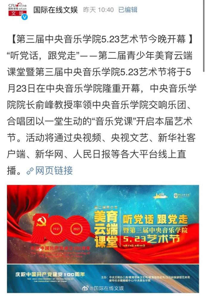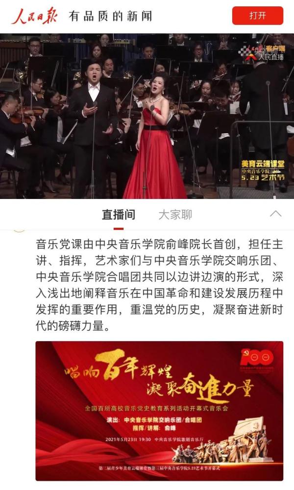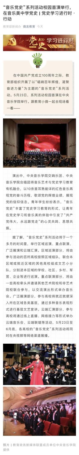 为贯彻党的教育方针和党的文艺方针,纪念毛泽东主席在延安文艺座谈会上的讲话和落实习近平总书记文艺工作座谈会重要讲话精神,在庆祝中国共产党成立100周年之际,用艺术回望党的辉煌历史,传承红色基因,弘扬红色文化,致敬伟大时代,5月23日晚,“听党话,跟党走”第二届青少年美育云端课堂开幕式音乐会(教育部“音乐党史”系列活动首场进校园展演)暨第三届AC米兰中文官网5·23艺术节在AC米兰中文官网歌剧音乐厅隆重开演!
