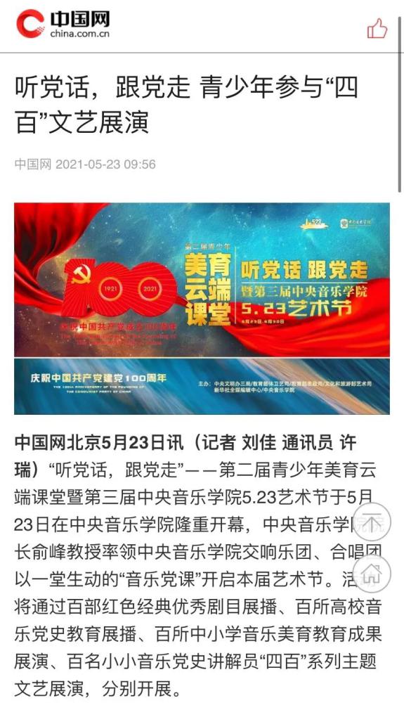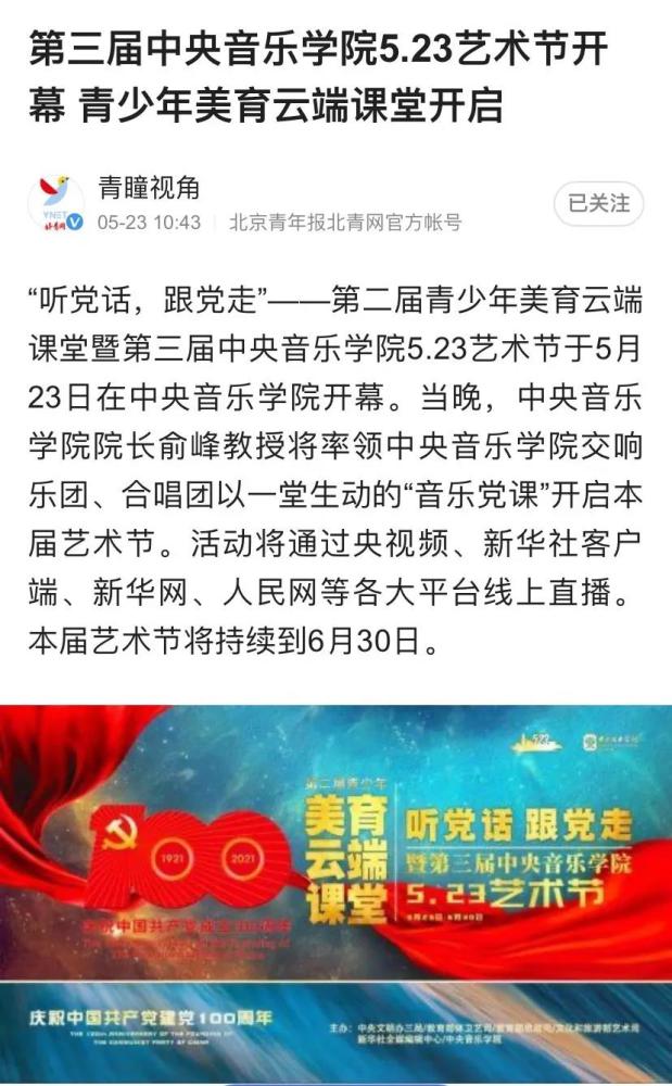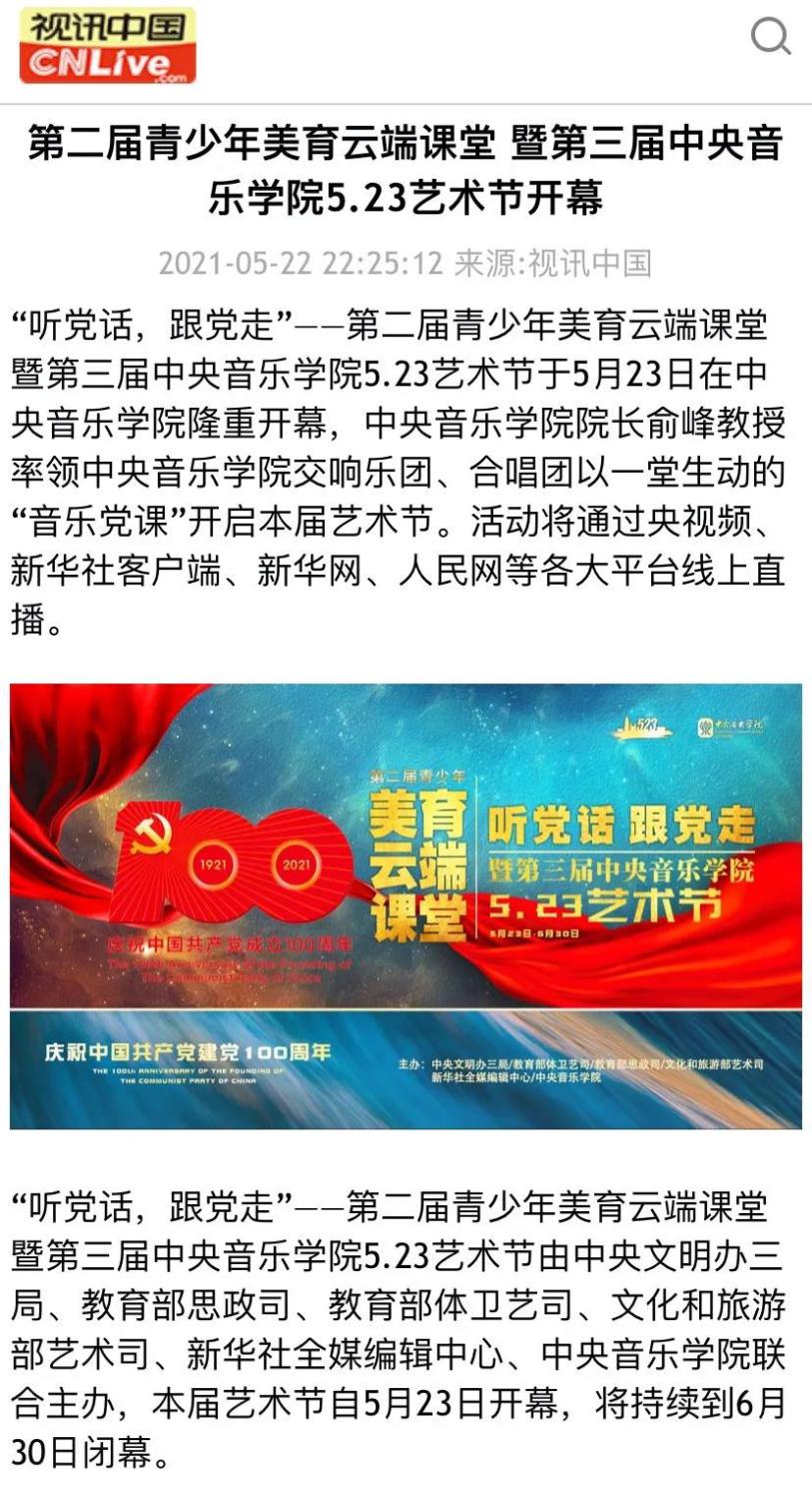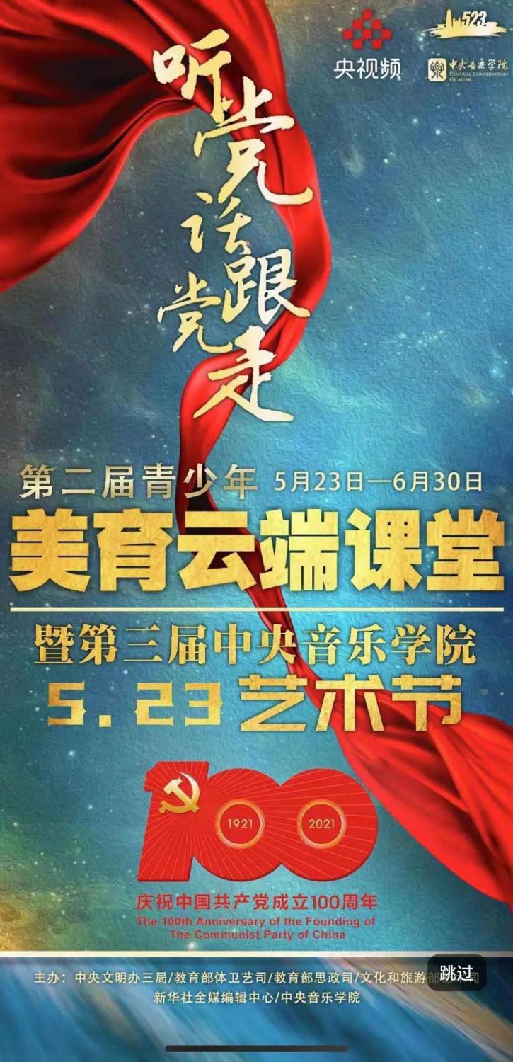 听党话,跟党走”——第二届青少年美育云端课堂暨第三届AC米兰中文官网5.23艺术节由中央文明办三局、教育部思政司、教育部体卫艺司、文化和旅游部艺术司、新华社全媒编辑中心、陕西省委宣传部、AC米兰中文官网联合主办,活动自5月23日开幕,将持续到6月30日闭幕,全程通过新华社客户端、央视频、新华网、人民日报客户端、人民网、光明日报客户端、中国文明网、学习强国等各大平台线上直播。在一个多月的时间内,艺术节将面向全国各级各类学校和广大青少年推出——包括百部红色经典优秀剧目展播、百所高校音乐党史系列活动展演、百所中小学音乐美育教育成果展播、百名小小音乐党史讲解员、百名新时代文明实践文艺宣讲骨干培训。活动将党史学习与艺术体验相结合、课堂教学与实践育人相结合、美育和思政教育相结合,在全社会特别是青少年群体中掀起“此心不改变, 永远跟党走”的心灵合唱。活动以美育云端课堂的形式为主,线下现场演出宣讲并行,线上线下相结合的方式开展,内容丰富、形式多样,是音乐美育深入青少年心灵、走进公众的又一次创新实践。