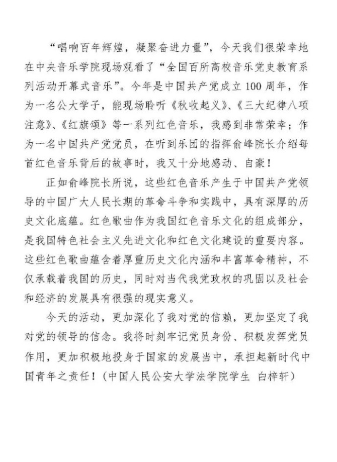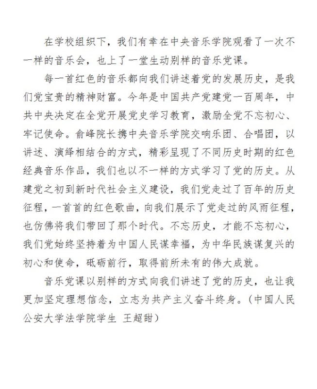 俞峰校长表示,红色音乐凝聚了中华民族由危亡走向新生继而迈向辉煌的厚重历史,记录着中国共产党领导中国革命、建设、改革、奋进新时代的恢弘历程,是中国共产党人红色基因和中华民族宝贵精神财富的重要组成部分,时至今日依然使人热血澎湃、激情奔涌。AC米兰中文官网发挥艺术院校的独特优势,首创“音乐党课”,用音乐感悟党史,用歌声铭记初心。今年是中国共产党成立100周年,在这个伟大的历史时刻,作为新时代的青年,要学党史、知党情、跟党走,知史爱党、知史爱国,要知道中国共产党为什么“能”、马克思主义为什么“行”、中国特色社会主义为什么“好”。希望当代青年学子能够牢记初心与使命,共同努力,一起朝着党和国家第二个百年奋斗目标和中华民族的伟大复兴奋进!
