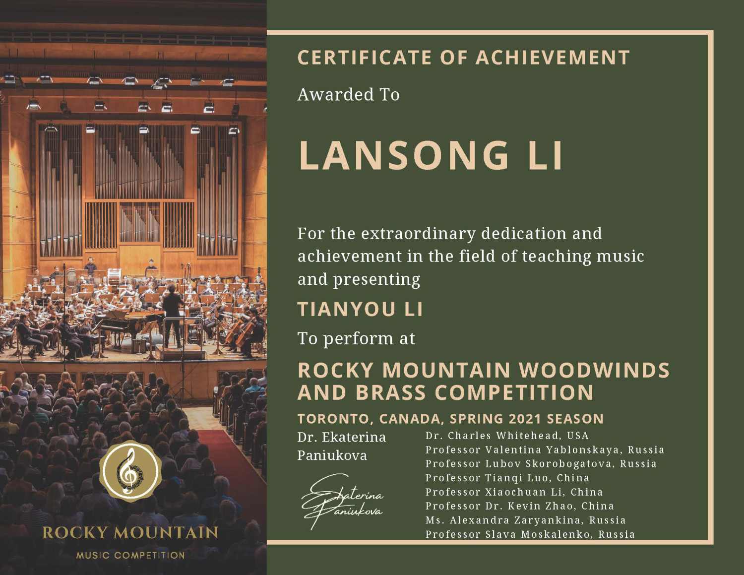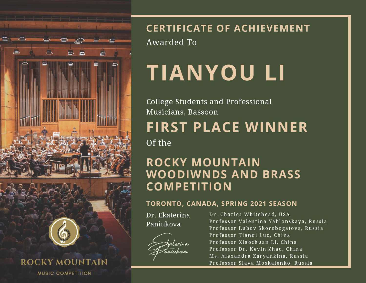 于2021年5月获得加拿大洛基山国际音乐比赛一等奖。