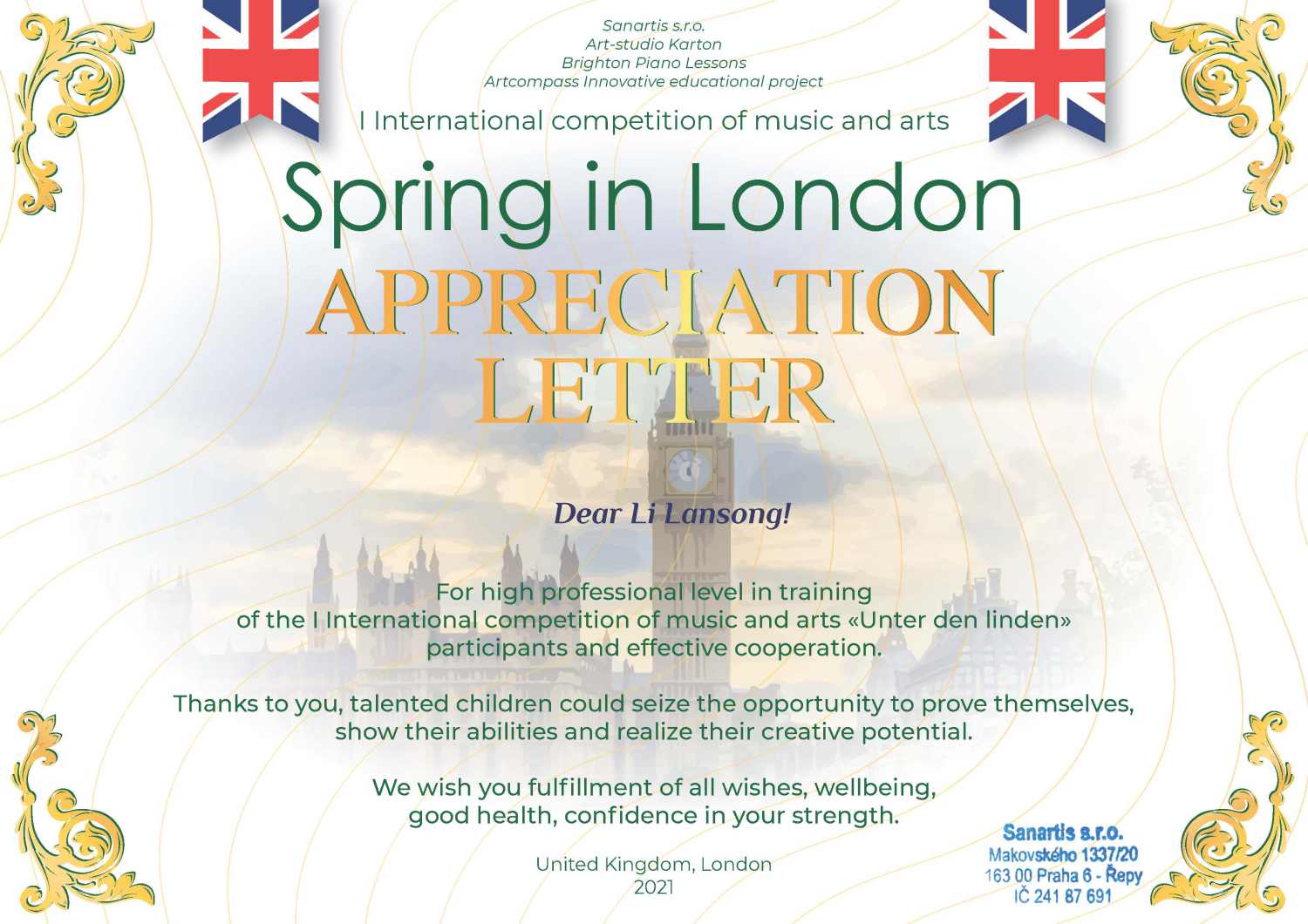 2021年伦敦之春国际音乐和艺术比赛由俄罗斯典范创作协会(2006年创立)主办,获得了英国艺术家的大力支持。