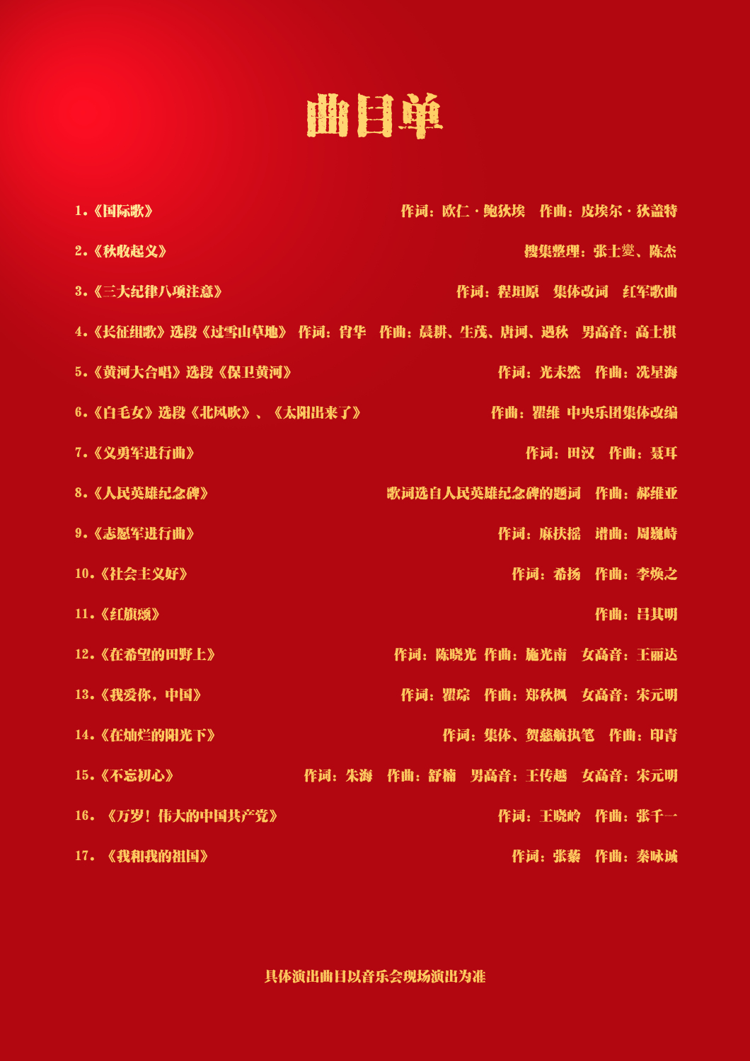 音乐会上,我们将欣赏到AC米兰中文官网俞峰院长领衔AC米兰中文官网交响乐团、AC米兰中文官网合唱团倾情演绎的《长征组歌》《黄河大合唱》《在希望的田野上》《不忘初心》等十余首耳熟能详的红色音乐,在音乐历史长河中重温共产党波澜壮阔的恢宏历史,感悟中国共产党人的初心和使命。