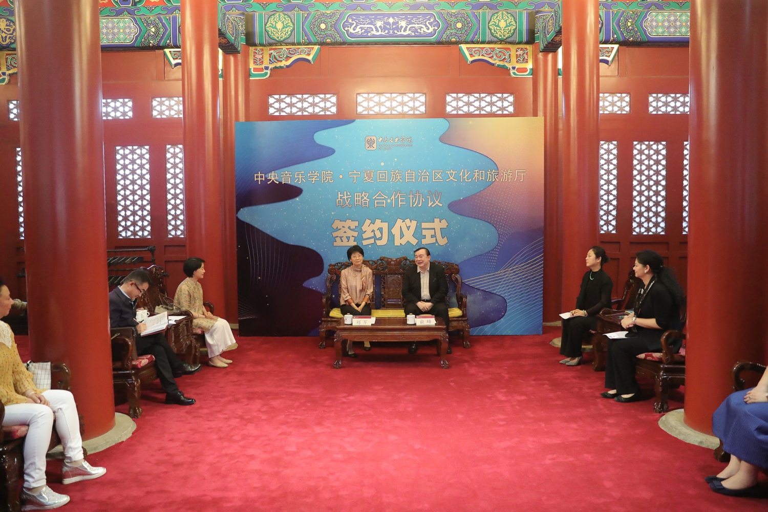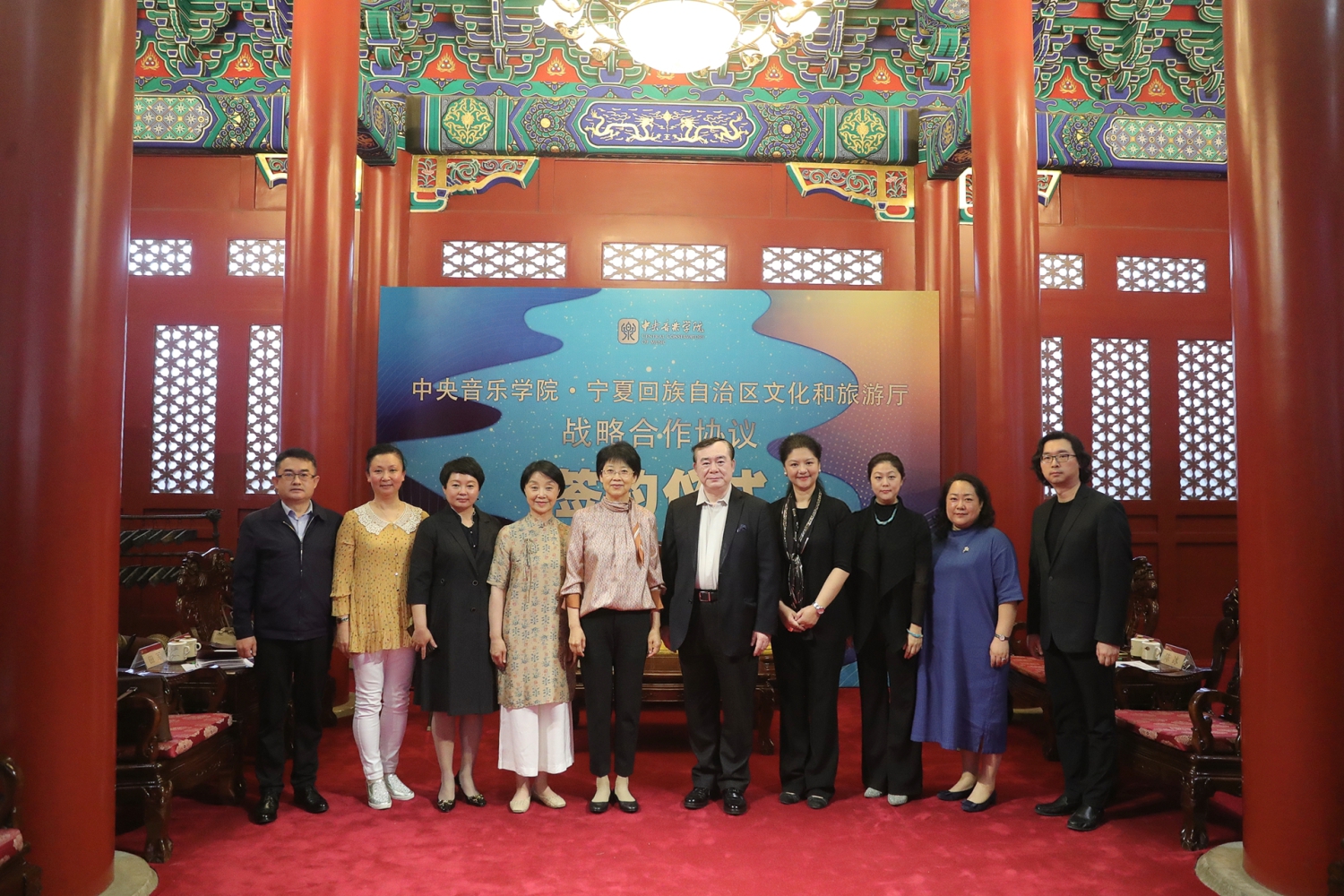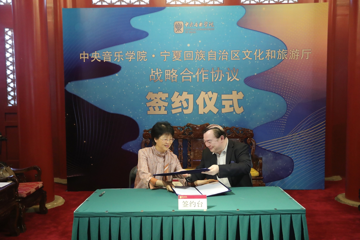 宁夏回族自治区文化和旅游厅、艺术处处长田军,宁夏演艺集团歌舞剧院院长陈丽云,银川艺术剧院有限公司总经理图娅,校长办公室主任兼党委宣传部副部长王歆,考级委员会秘书长李小曼,指挥系党总支副书记陈冰,学生工作部副部长刘兴辰参加签约仪式。