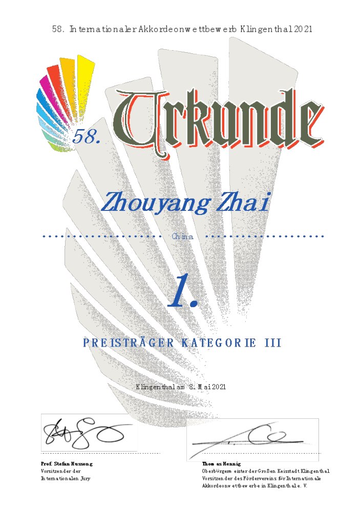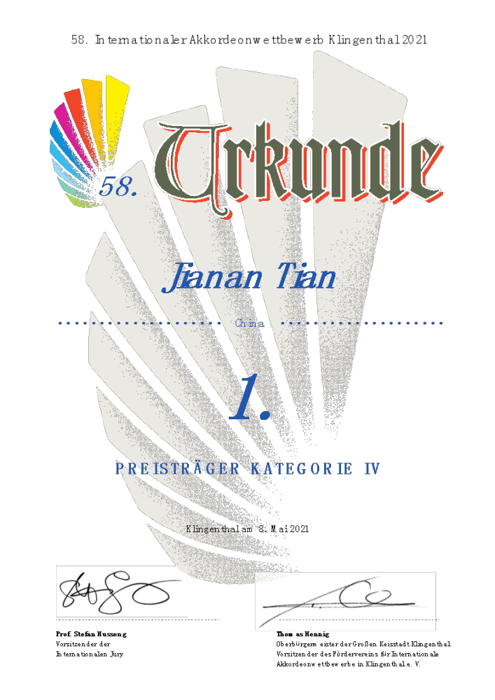 2021年5月2日至8日,第58届德国克林根塔尔国际手风琴比赛 (58th International Accordion Competition Klingenthal)于线上隆重举行,经过激烈角逐,米兰钢琴系博士二年级学生田佳男获得独奏家组第一名;附中高二学生翟周洋、张乃心分别获得青年组第一、第二名。
