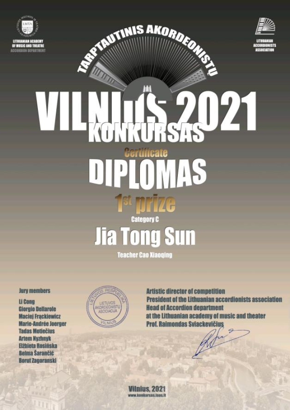2021年4月,在立陶宛维尔纽斯国际手风琴比赛(Vilnius 2021 International Accordion Competition)中,附中初二年级孙家桐和崔希言分别获得少年组第一名、第二名。