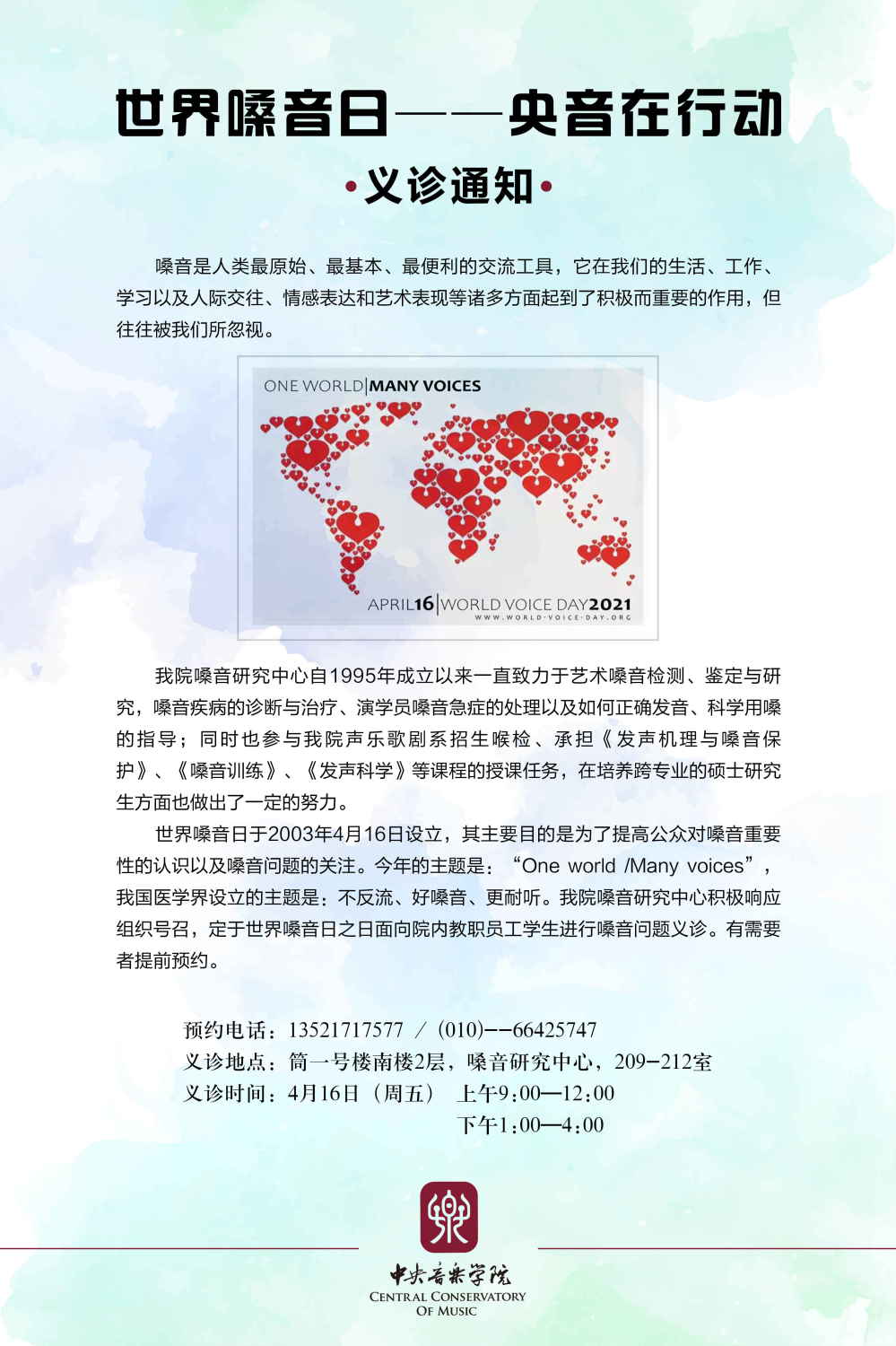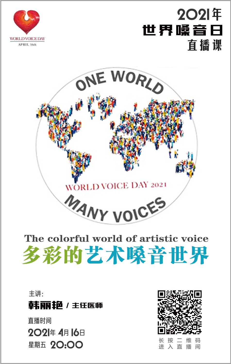 今年世界嗓音日官网的主题是:“One World/ Many Voices”(一个世界,多彩的声音);我国医学嗓音界为今年世界嗓音日设立的主题是:“不反流、好嗓音、更耐听”;米兰嗓音研究中心为今年世界嗓音日设立的主题是:“避免反流,科学发声,因爱守候”。