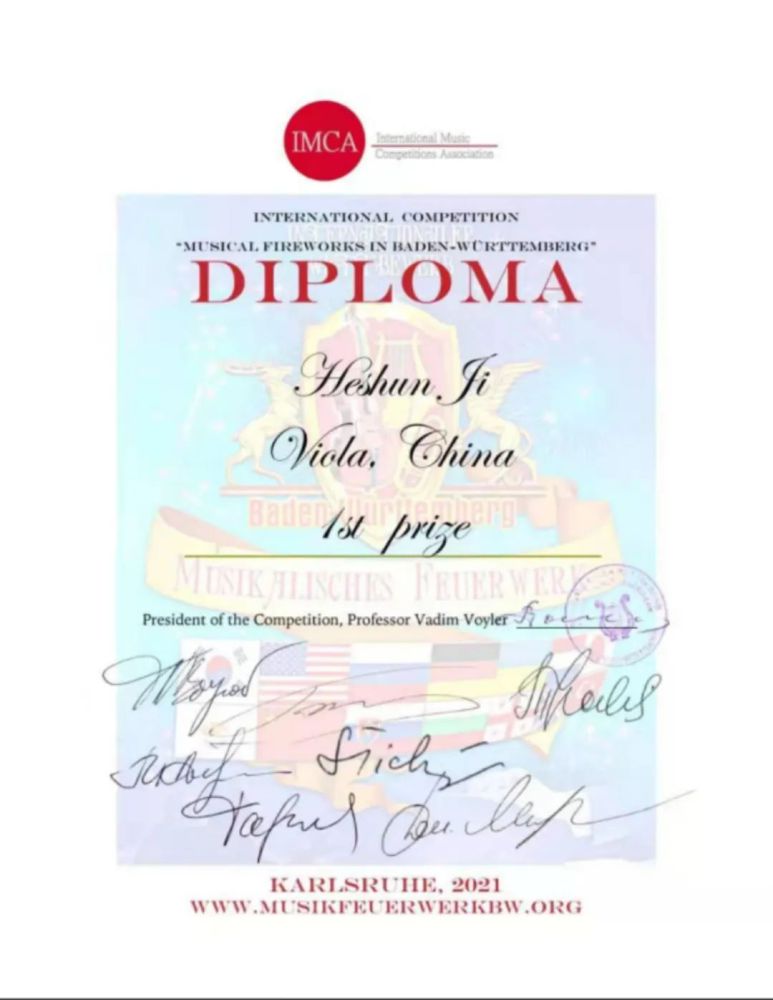 2017第52届德国马克诺伊基兴Markneukirchen国际中提琴比赛第一名。