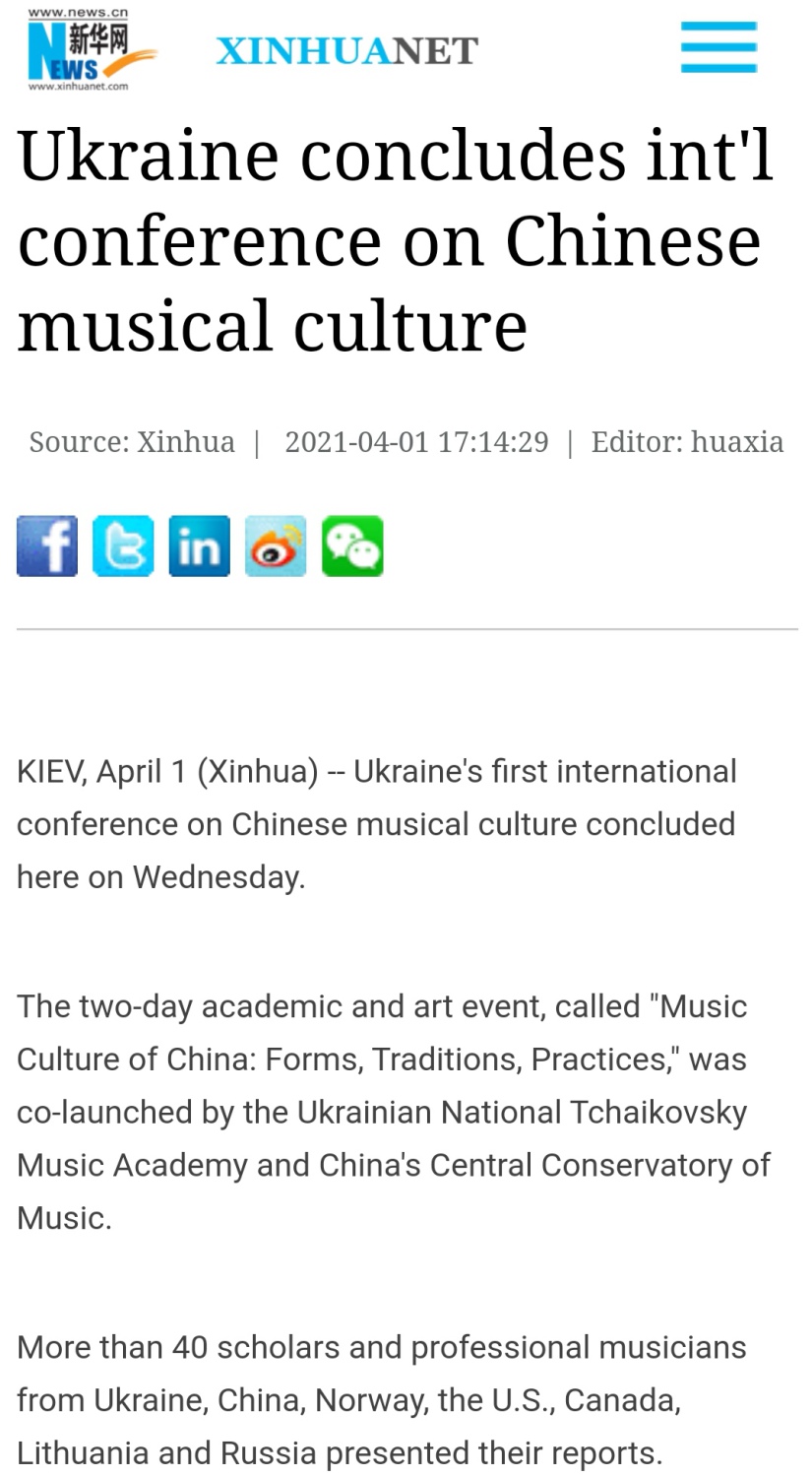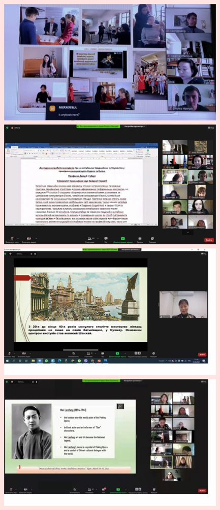 为进一步促进乌克兰社会各界以及“一带一路”沿线国家,并辐射北欧及美国对中国音乐文化更为深入与全面的了解,乌克兰音乐孔子课堂联合中乌以及跨国多个机构,举办此次由“学术报告”和“音乐作品展演”两部分组成的线上国际研讨会。来自乌克兰、中国、立陶宛、美国、挪威等国的40余位音乐研究领域专家学者和表演艺术家,包括:柴院校长季莫申科•马克西姆教授、学术事务副校长兼音乐孔子课堂外方院长维多克•邦达丘克教授、世界音乐历史系系主任扎尔科娃•瓦列里娅教授、室内声乐系主任安东尤克•瓦伦蒂娜教授,米兰音孔办及基地主任刘月宁教授、副主任张乐心博士,敖德萨国立涅日达诺娃音乐学院科研副校长萨莫伊连科•亚历山德娜教授,美国中田纳西州立大学中国音乐文化中心主任韩梅副教授等学者专家;国家非物质文化遗产梅花大鼓传承人、中国曲艺家协会副主席籍薇,湖南省昆剧团团长罗艳,中国曲艺家协会副主席、评弹名家盛小云等戏曲艺术家,围绕:中国民歌、戏曲、民族器乐的历史与发展现状,中国当代歌剧及器乐创作及音乐教育等多个主题,分享了自己的研究成果,也体现出乌克兰等各国学者们对中国音乐文化的高度关注和研究热情。