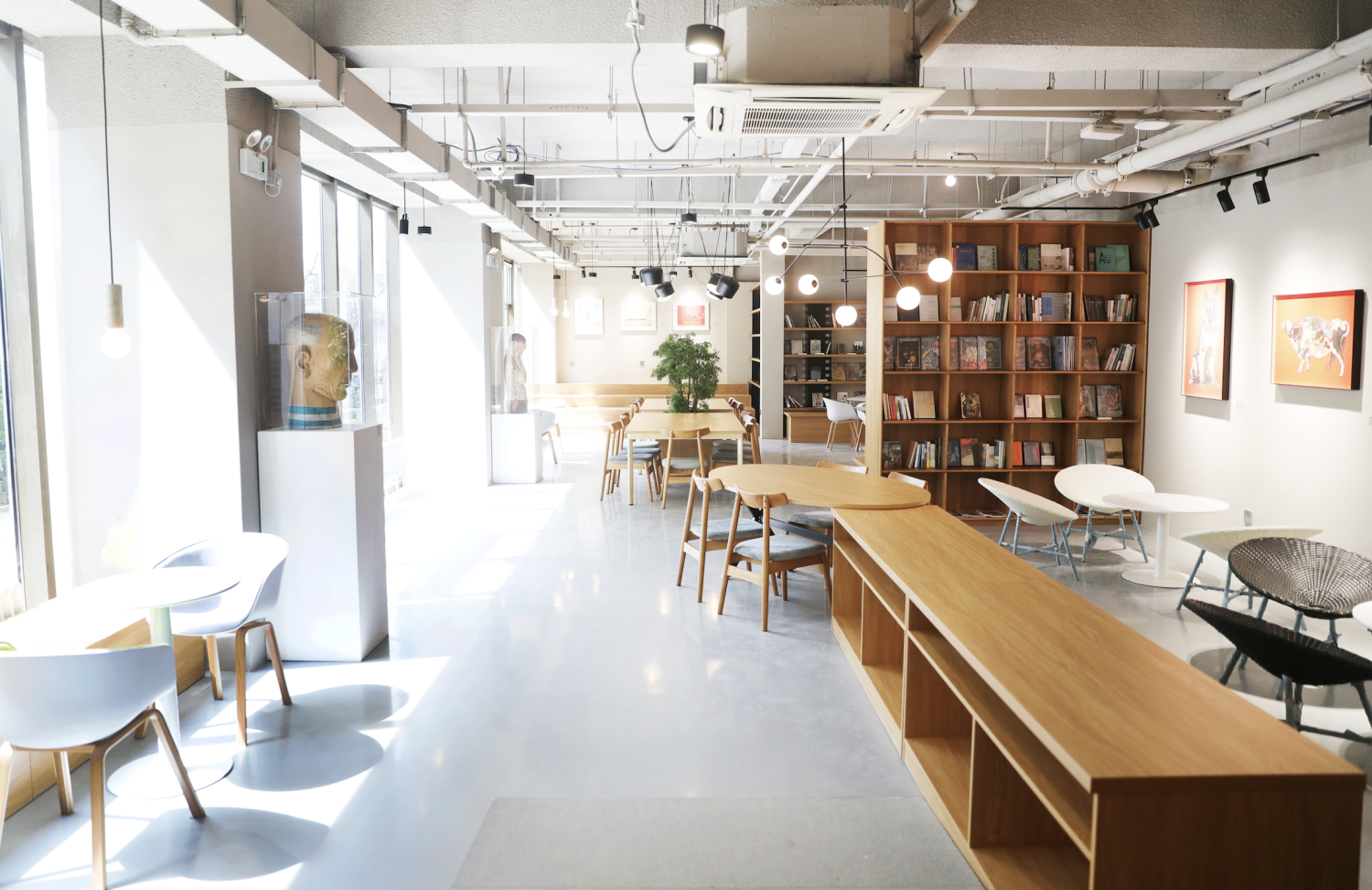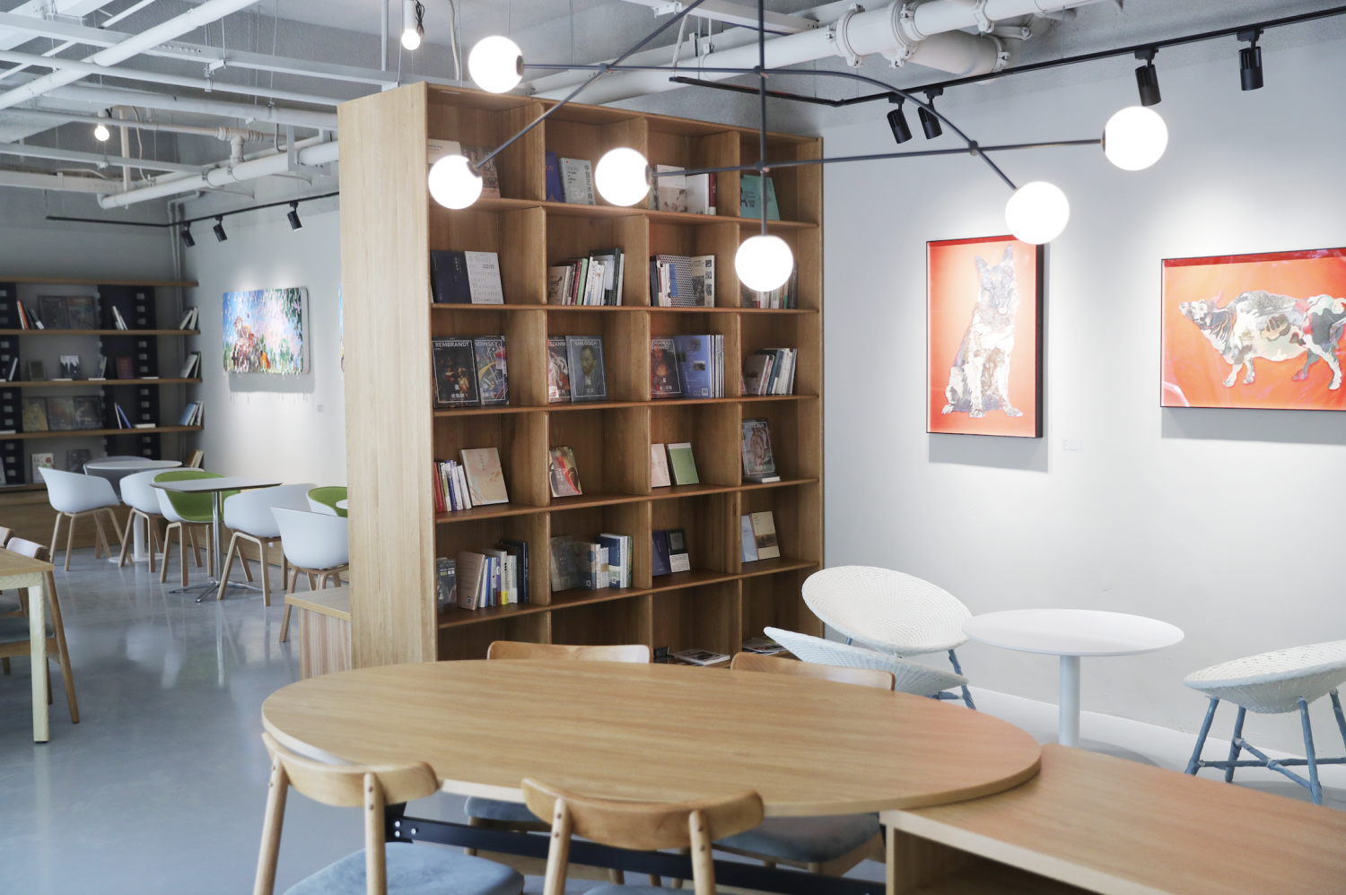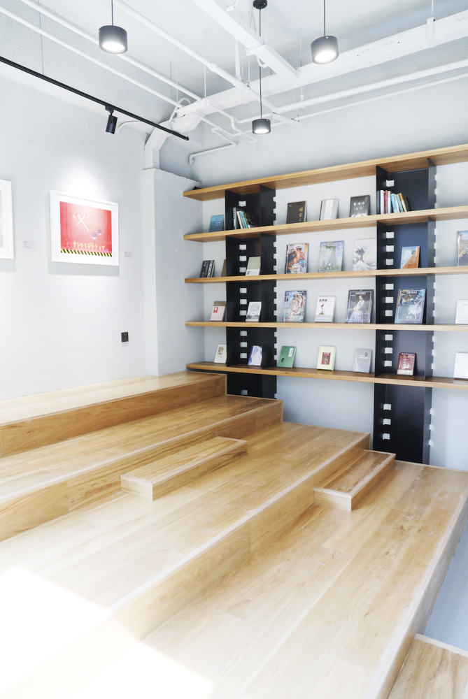 书架上陈列了涵盖哲学、艺术、文学等各个领域