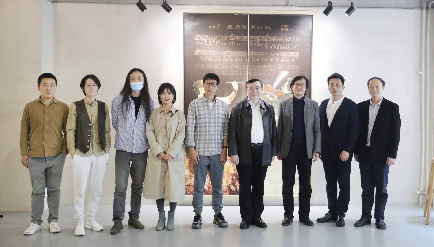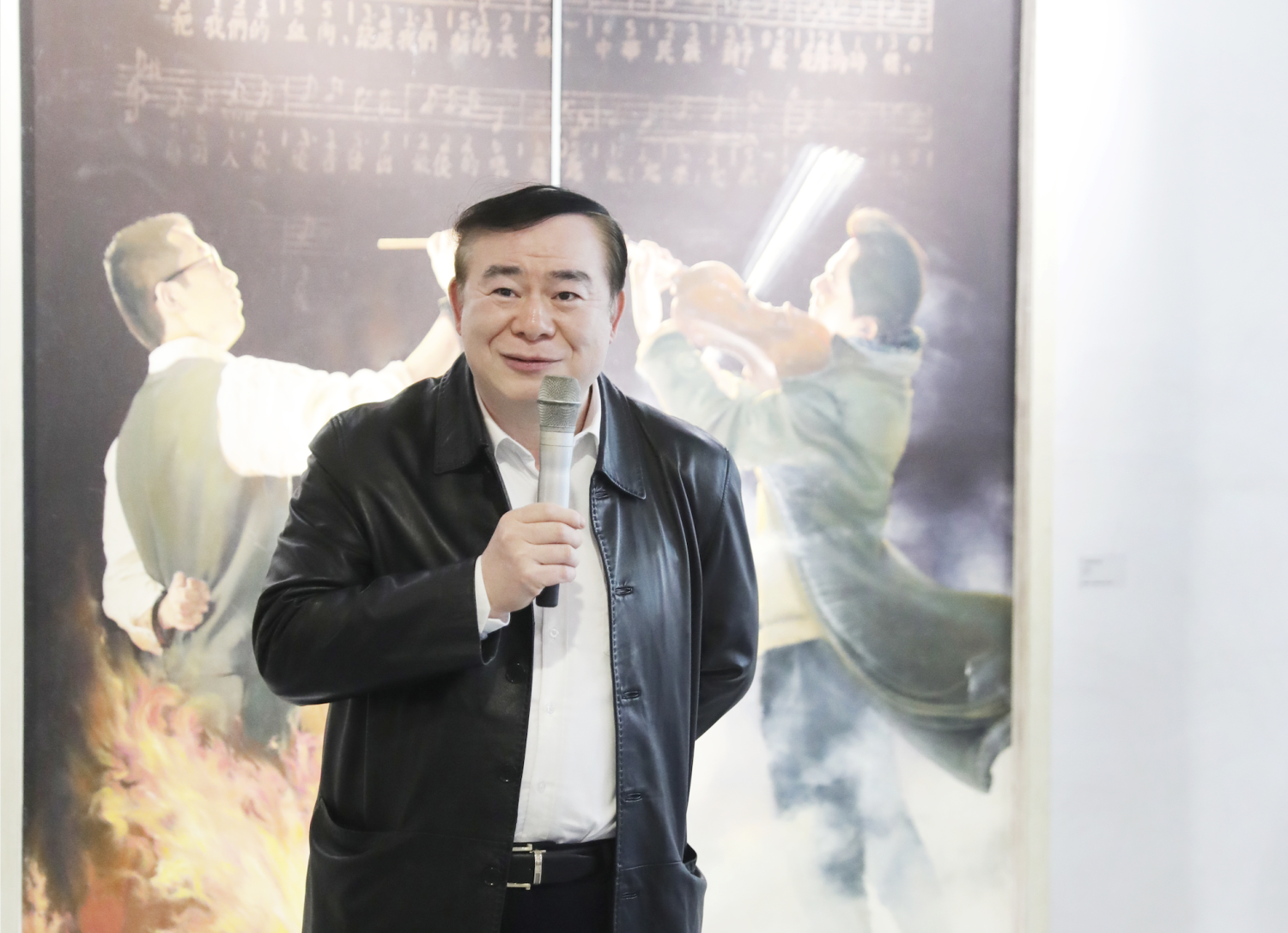 绘画《义勇军进行曲》作者贺鹏琪代表参展艺术家发言。他讲到,音乐和美术是两种不同的艺术形式,是两种最具代表性的艺术语言,绘画是凝固的音符,音乐是流淌的笔触,相信两者的结合会迸发更加绚丽的艺术之光。