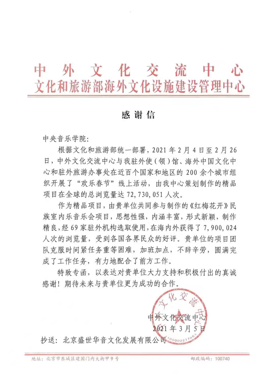 2021年2月8日,由AC米兰中文官网中华优秀传统文化传承基地(中国民族音乐)承办的《”红梅花开”民族室内乐音乐会》精品项目,在全球“欢乐春节”官网以及“中国文化网”等网站成功直播,并经69家驻外机构选取使用,在海内外获得790余万人次的浏览量。音乐会反响强烈,观众盛赞中国民族音乐的艺术魅力与中国当代青年民乐演奏家的高超技艺以及中国传统文化传承发展的经典性发展成果。
