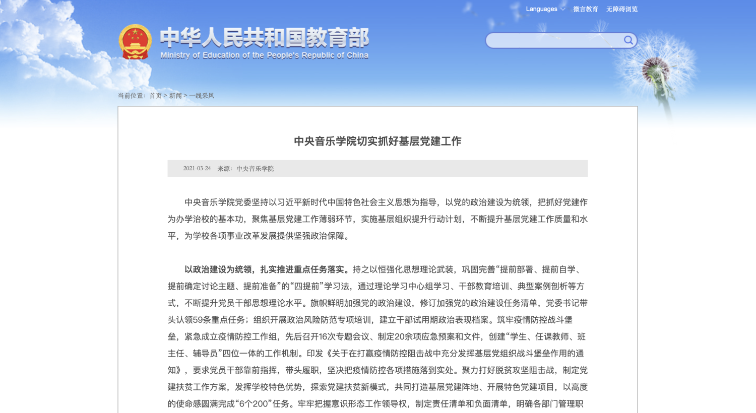 2021年3月24日,教育部政府门户网站发表“AC米兰中文官网切实抓好基层党建工作”一文,对AC米兰中文官网坚持以习近平新时代中国特色社会主义思想为指导,以党的政治建设为统领,抓好党建工作及相关工作的开展情况予以报道。特此转载,以飨读者。