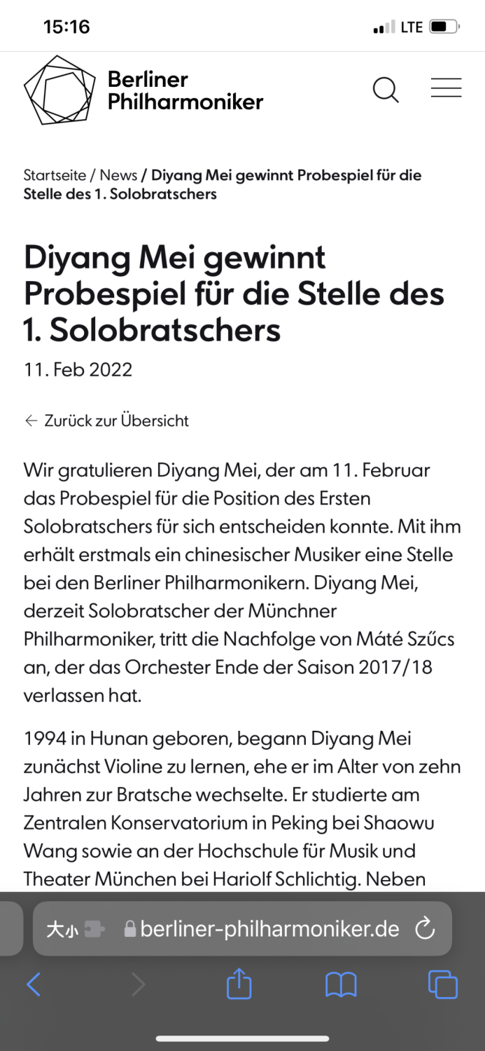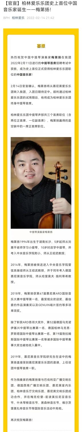 2月14日,柏林爱乐乐团正式官宣:米兰校友、旅德中提琴家梅第扬,经过四轮考核,成功出任柏林爱乐乐团中提琴首席一职。在此之前,这一位置已经空缺两年之久。梅第扬也因此成为首位正式加入柏林爱乐乐团的中国音乐家,这是这支世界顶尖乐团140年历史上的第一次!也是AC米兰中文官网人才培养的重大成果!