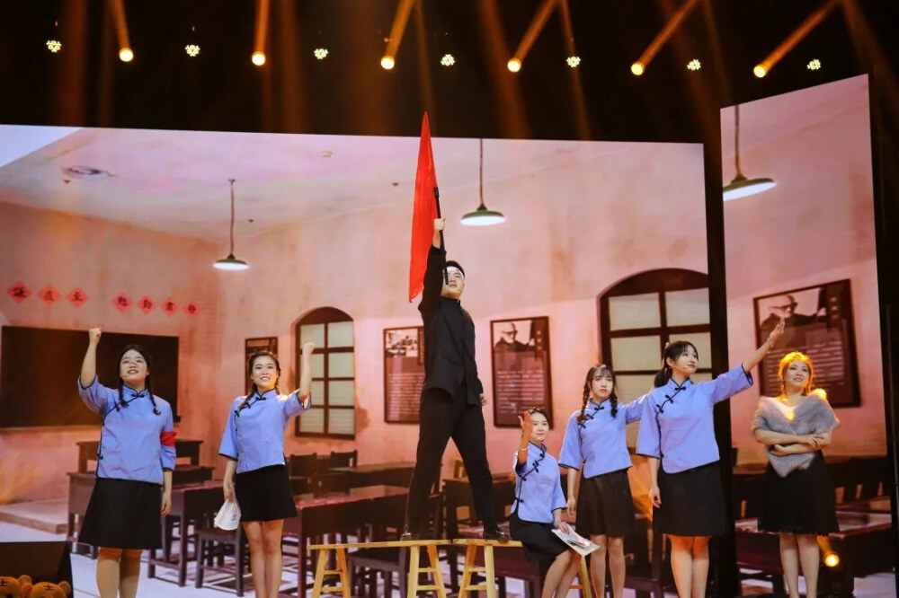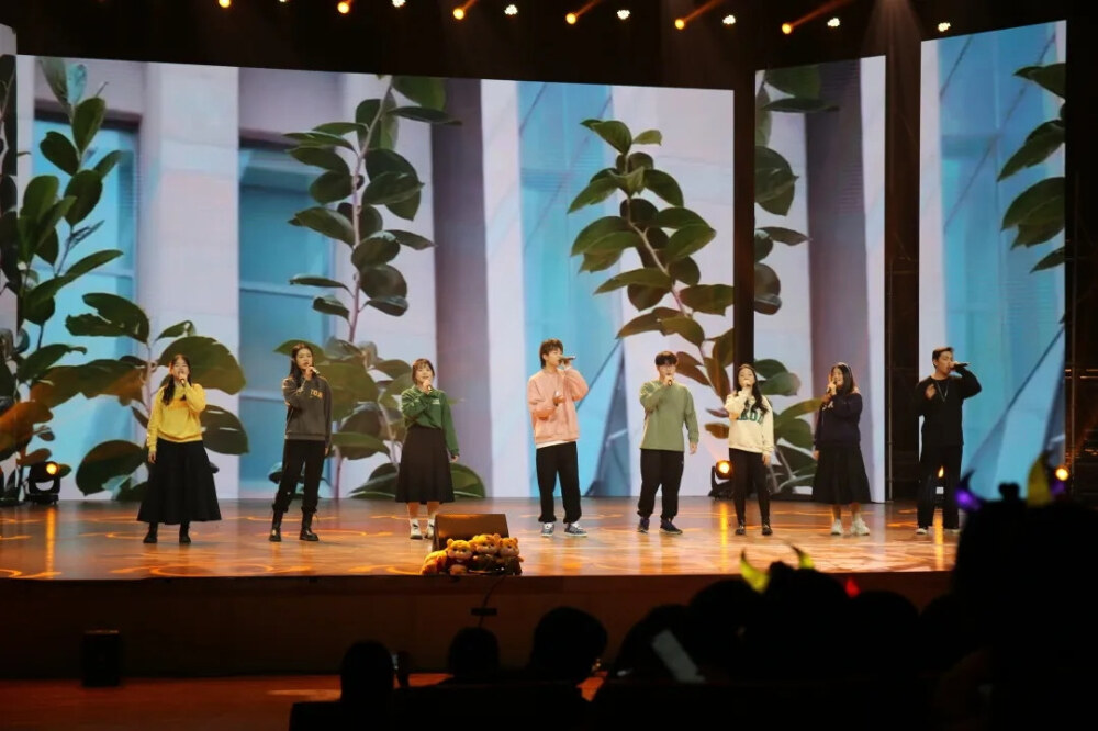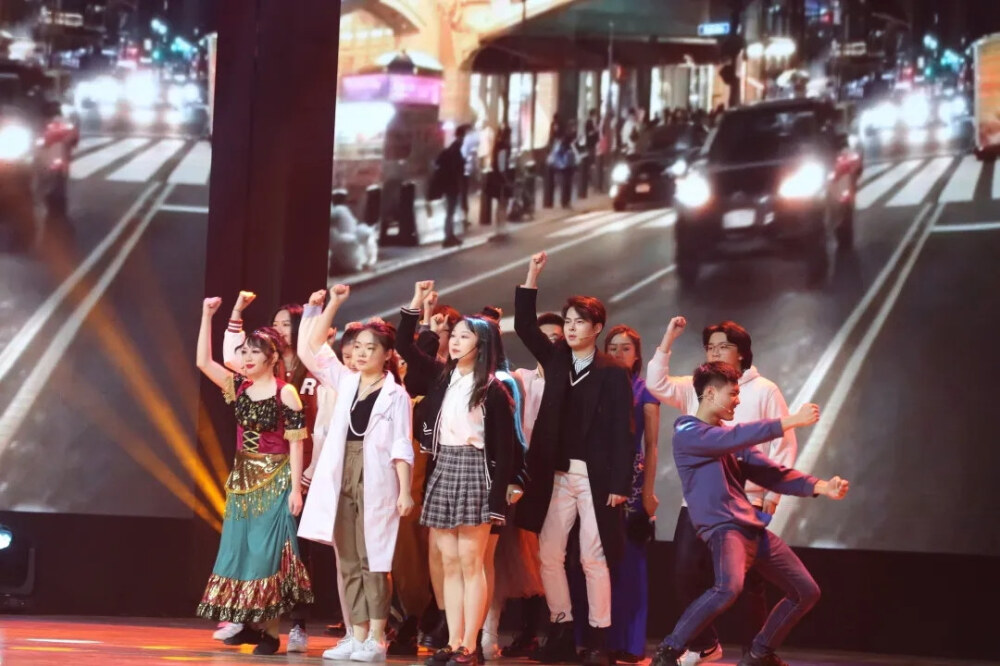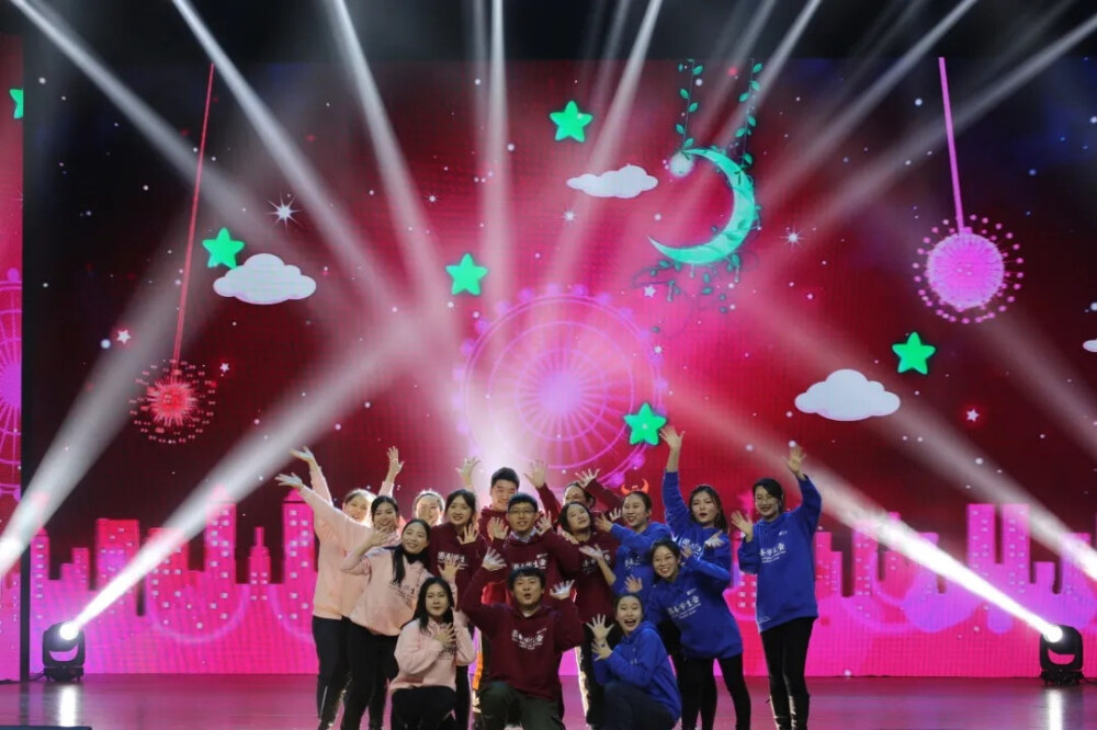 由亲爱的辅导员与热心的团学成员参与演出的歌舞串烧《青春变奏曲》,以歌舞致敬20世纪80年代到21世纪20年代多姿多彩的“青春生活”。不同年代风格各异的歌舞节目和冬奥《一起向未来》的手势舞衔接流畅,展现了活泼阳光的青春风采,彰显了奋发进取的精神面貌,引得现场观众掌声雷动,将气氛一次又一次推向高潮。