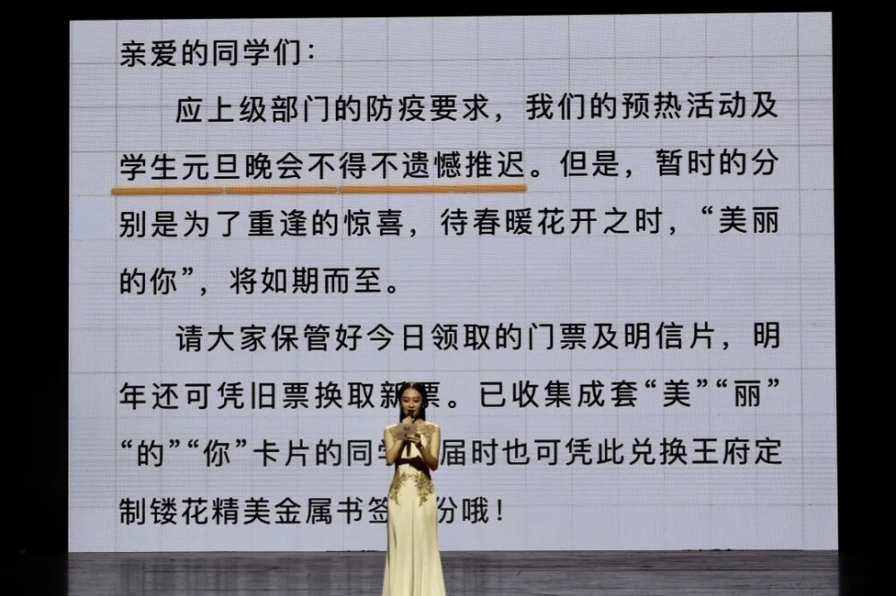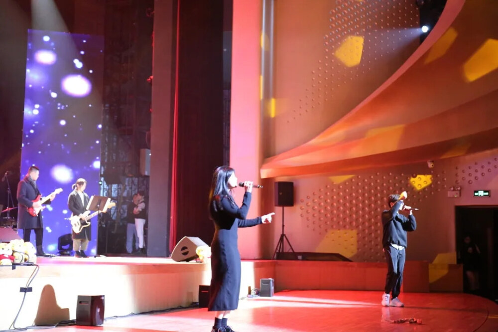 疫情虽然暂停了2021年学生元旦晚会,但没有浇灭我们的热情。在学生处、团委的精心组织和学生会、研究生会的积极配合下,2022年学生元旦晚会终于顺利举办。歌曲《美丽的你》由团委、学生会、研究生会各部门负责人倾情献唱,唱出了大家的心声,唱出了满满的情谊。晚会也在这悦耳动听、感人温暖的歌声中走向了尾声。