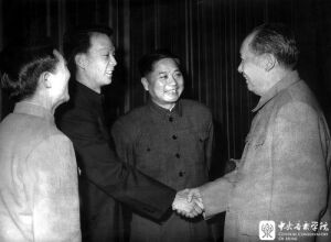 上,时任学校党委书记、副院长赵沨(右2),向毛主席介绍刘诗昆(左1)、殷承宗(左3)和新疆班同学。
