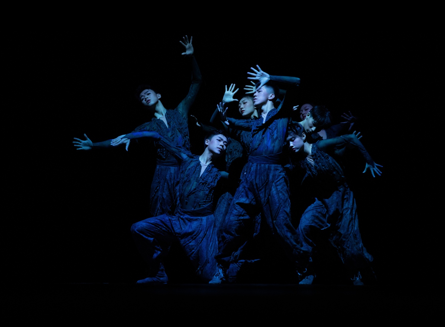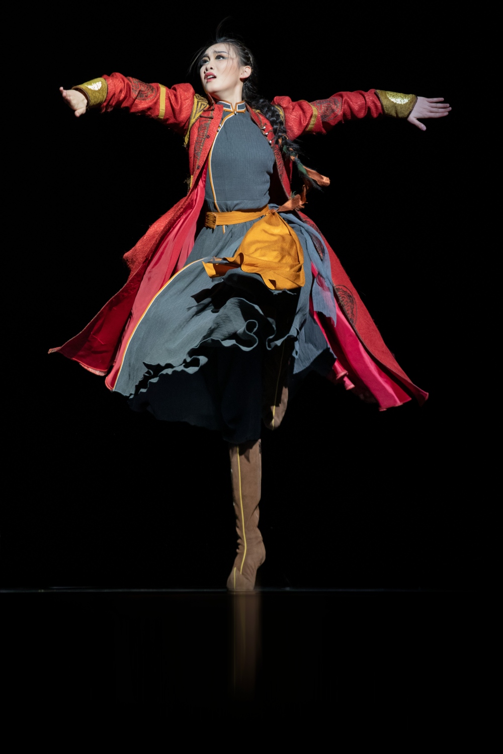 第八首作品民族舞《他乡》,曾雪琦编舞,马小喆作曲。本作品试图探讨社会结构改造下“奔赴异乡”的不可抗性与边缘群体的选择权话题,窥探光明面背后那暗潮汹涌的另一种可能。人在他乡,或是对美好未来的主动追求,也可能是无奈的流放;或是满心期待和憧憬,也可能是深感恐惧彷徨。“我所依恋的额尔古纳河是一轮月亮,悉数抚摸我的伤痛;我所神往的额尔古纳河是一轮太阳,由神托举着照亮我回家的路。”音乐设计中,呼麦的开场与极其带感的中国大鼓可谓是作品中的亮点,浓厚而深沉,将观众引入音与舞的奇妙盛宴,感受蒙古族大气且深沉的情怀…