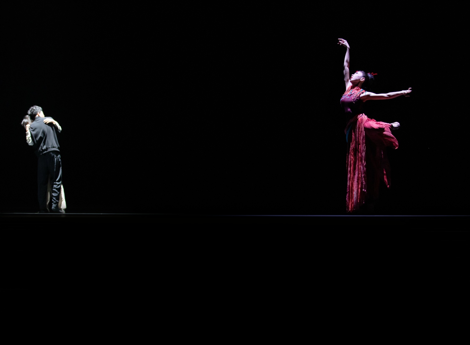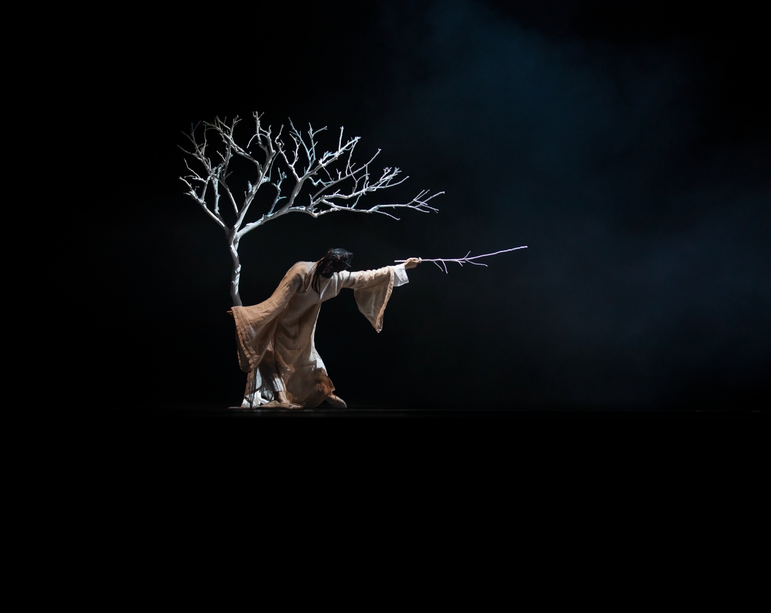 一人跪坐,一束追光,一棵枯树,舞者执枝而舞,乐队的拨弦重复着同一个动机,其上衬箫;作品张弛有度,对材料的运用更是简洁大方,“慢-快-慢”的逻辑结构像一个完整的轮回,舞者从树下动身,尽情舞跃,看遍山水,最终依然携枝回到原点,画圈为境。