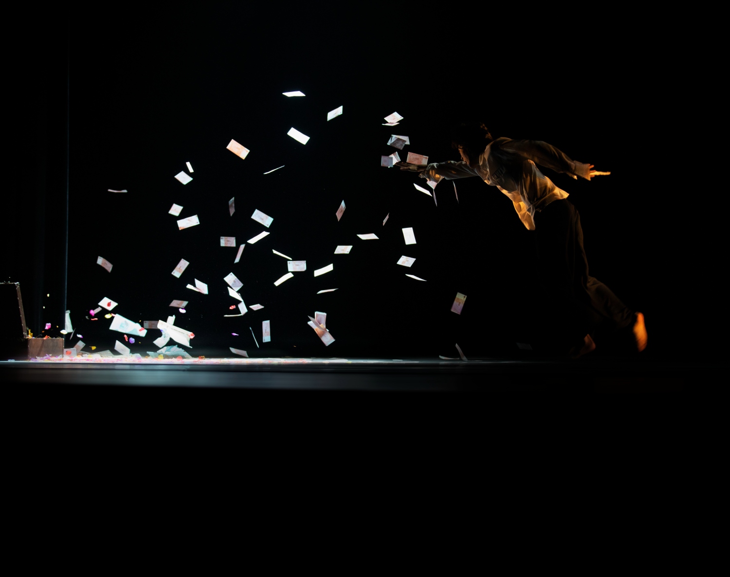 作品使用十二音的音乐语言,与传统乐器鲜明的民族风格撞出奇妙的色彩,倚靠整个乐队重音和节奏的变化带来力度与速度的转移,云谲波诡。编导使用一只深色皮箱隐喻主角的“人生碎片”,主角用力地拖拽和占有却依然“盈锁深箱”,终于打开时各色碎片的喷洒,连同箱子、欲望、人生、音乐,以及穿插点明立意的舞者们,共同叹于世事奈何得哲理思意。